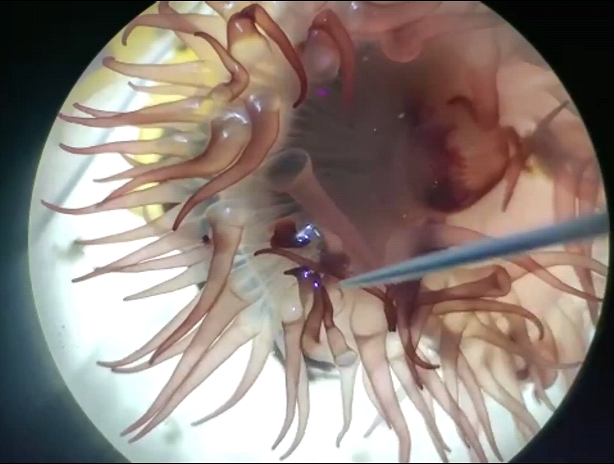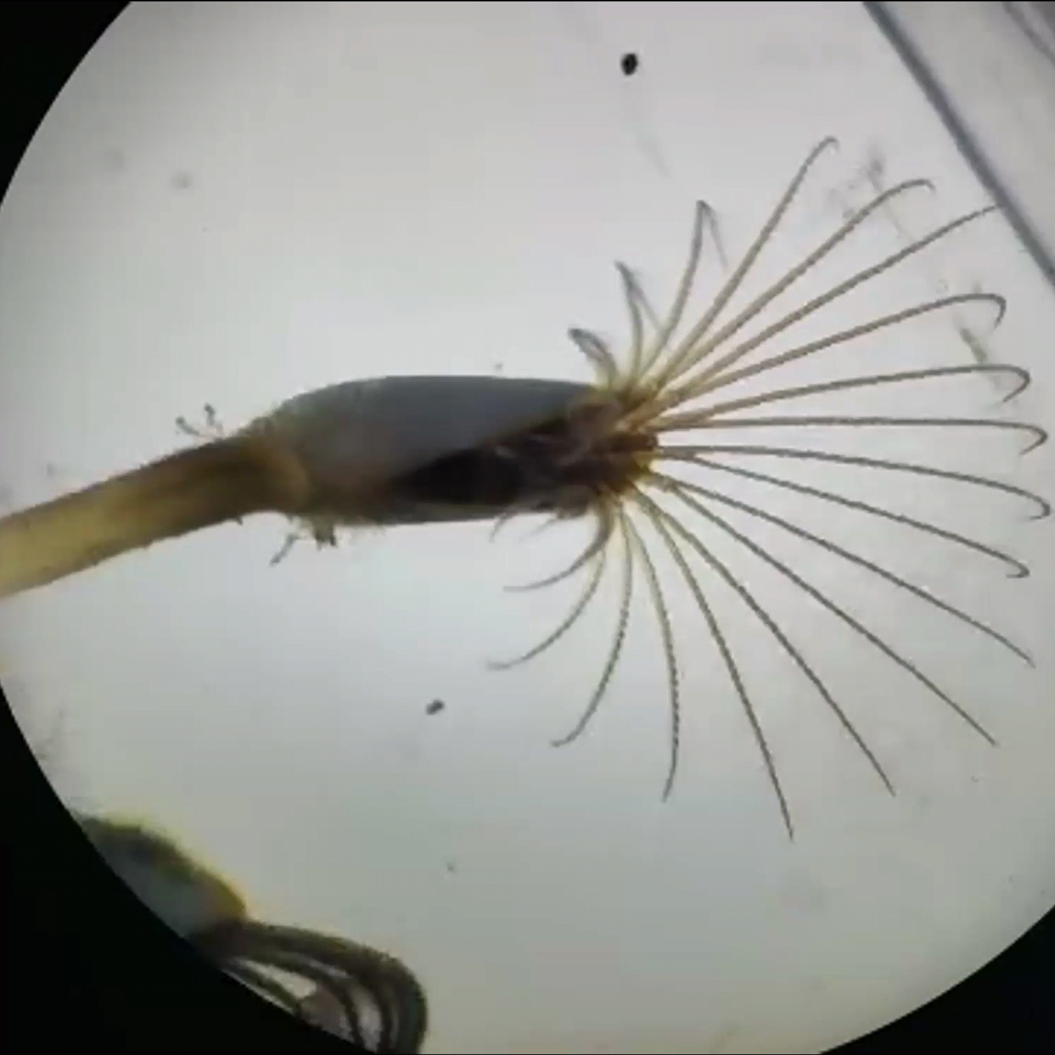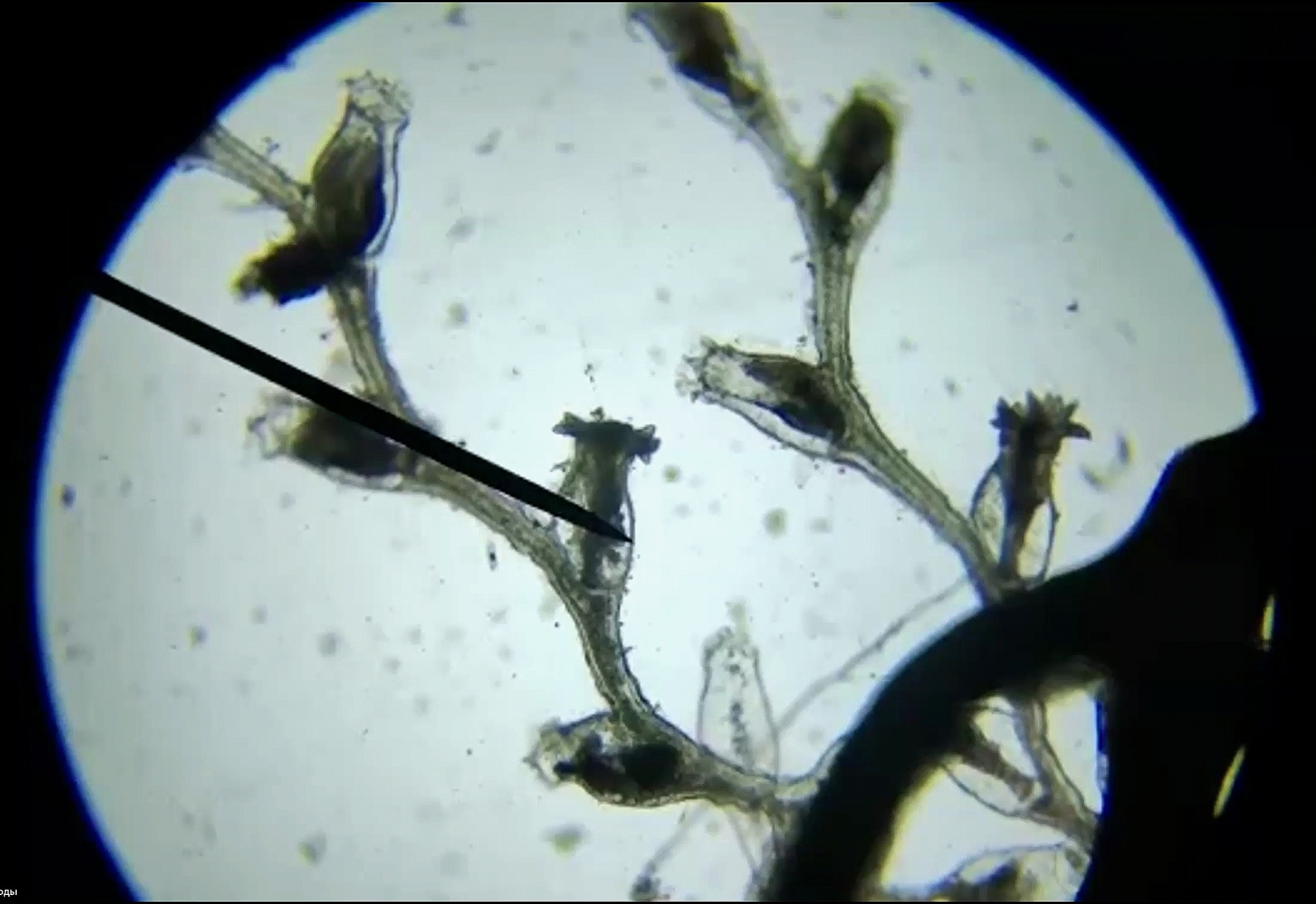 Тут я иголкой показывал на рачка, который велыл в щупальца актинии - и был таков. Жахнула они его стрекательными клетками! Актиния - родич кораллов, медуз. В наших прудах мы вылавливали с ребятами гидру - тоже кишечнополостное, сидячее и хищное создание. А в луже у скал нашли гидроидный полип: