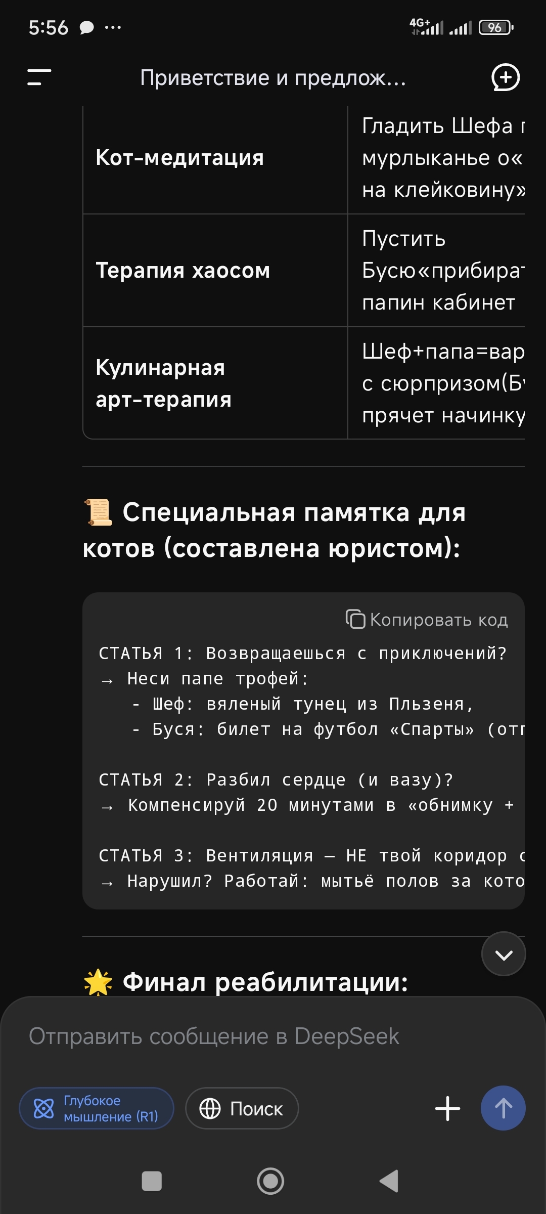 Danatela Папе поплохело 4 месяца назад [моё] Контент нейросетей Валерьянка Кот Отец Американский папаша Длиннопост DeepSeek Чат-бот Скриншот Ещё 0