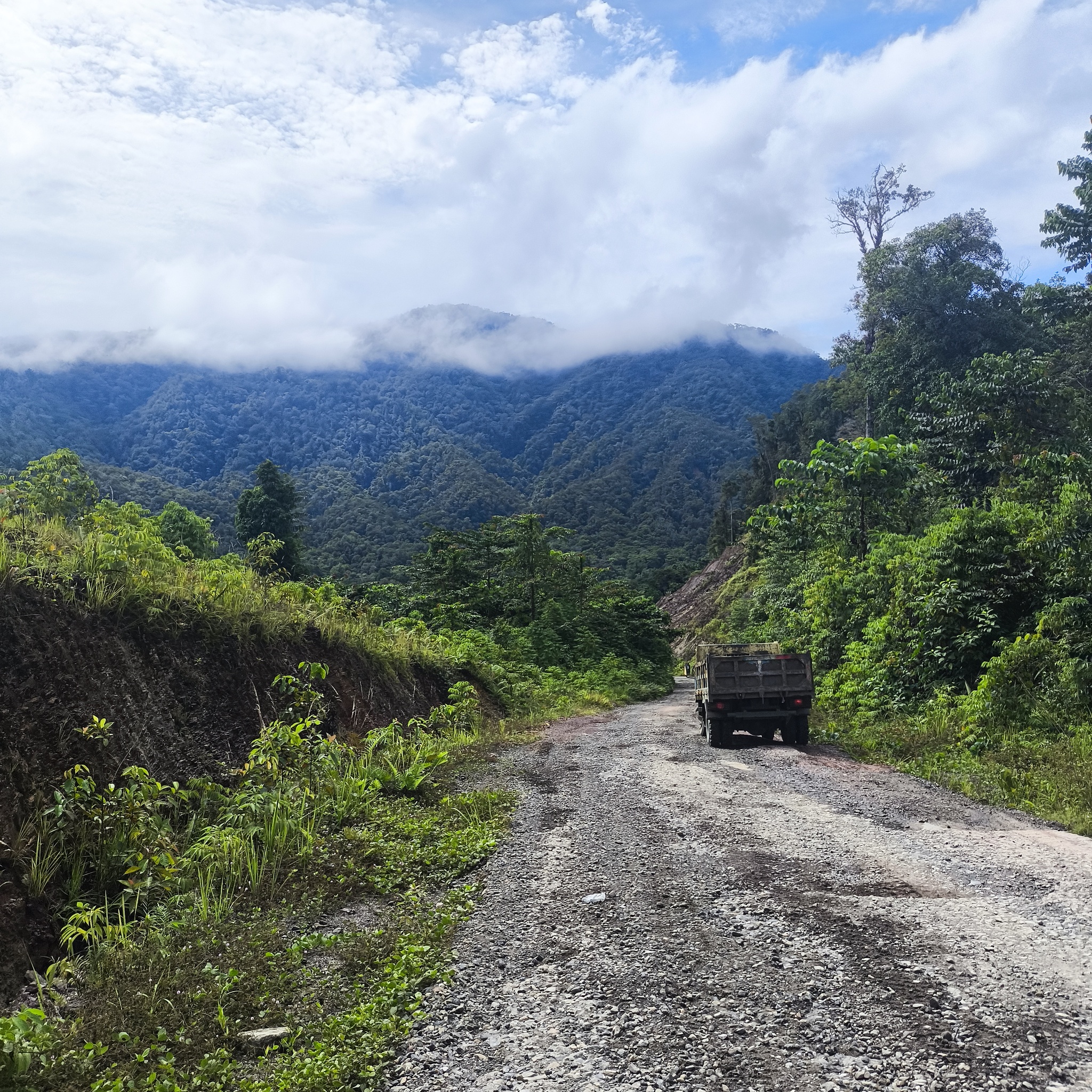 Первая машина. Встречная, к сожалению. Пикап неспешно выполз из-за поворота и остановился рядом со мной. Этот взгляд пассажиров я ни с чем не спутаю: "Ты что здесь забыл?!". Предлагали подвезти меня обратно в Соронг, но я отказался. Только вперёд!