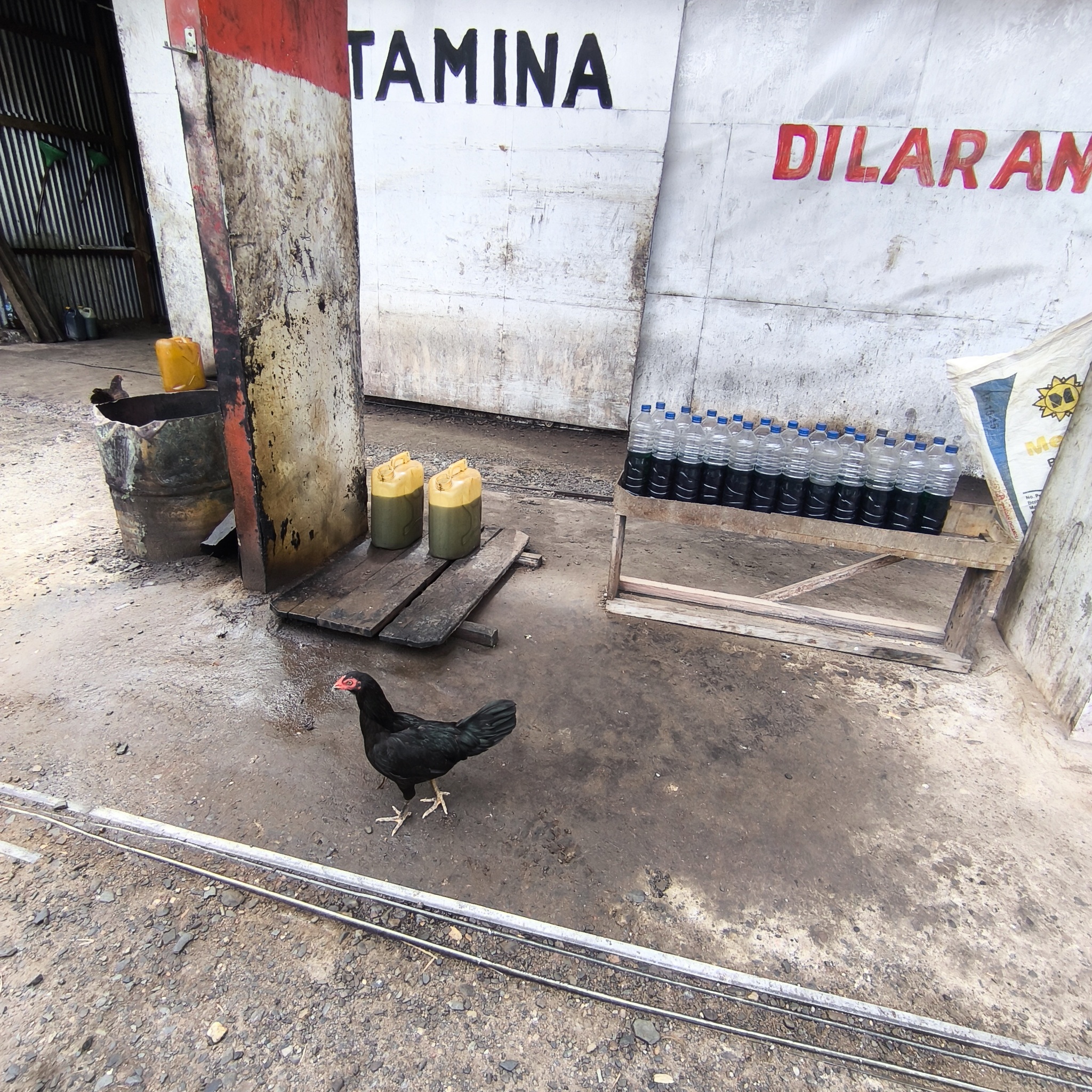 Мы добрались до небольшой деревеньки и заглянули на заправку. Зрелище то еще! Десяток канистр под навесом и пара десятков бутылок, воронка - вот тебе и весь сервис. В качестве охраны вокруг машины крутится курица - можно не беспокоиться.