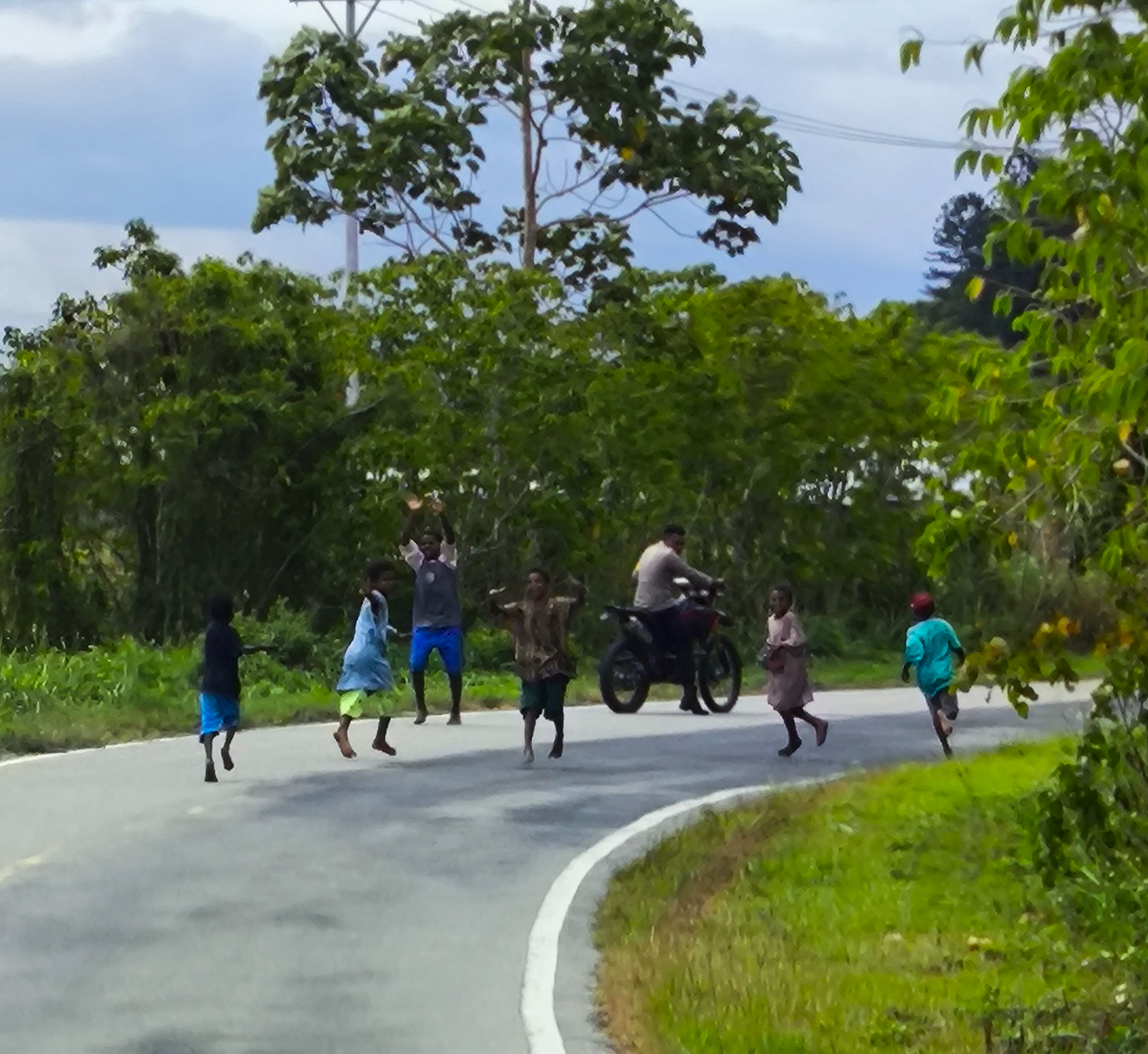 Уйти незаметно не удалось. За мной увязалась детвора. Сначала держались метрах в 50 позади, потом осмелели и подошли ближе. Спросили, зачем мне паранг. Да, "белый" с мачете на рюкзаке явно вызывает много вопросов, но зато опасаюсь всего вокруг не только я. Получив ответ ("Для установки лагеря, я живу в палатке"), они попросили сделать с ними фото на мой телефон и убежали наперегонки на мопед к полицейскому. Помахали вслед!
