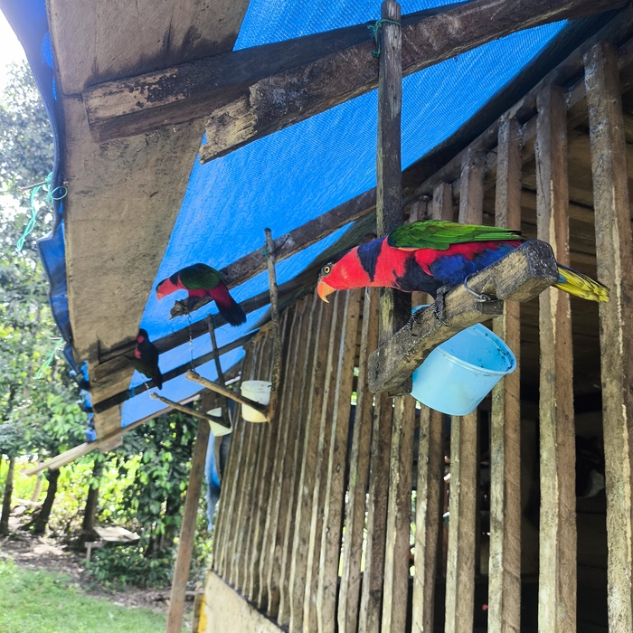 А под брезентовой крышей дома живет несколько попугаев, таких же как у Хэнки. Узнал, что здесь их зовут Нури. Хозяйка по имени Мэри угостила нас бананами. Когда я пишу "нас" — это значит, что меня и попугаев. Приручают? Надеюсь, на цепь не посадят!