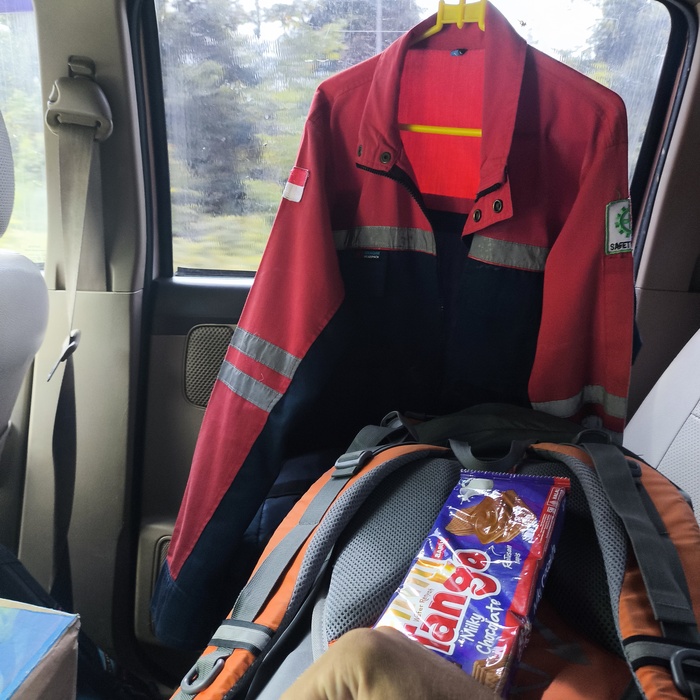 В салоне машины было место и меня пригласили внутрь, где я познакомился с Гои и Хакимом. Здесь же висела рабочая форма с надписью Safety First. Едут на вахту?