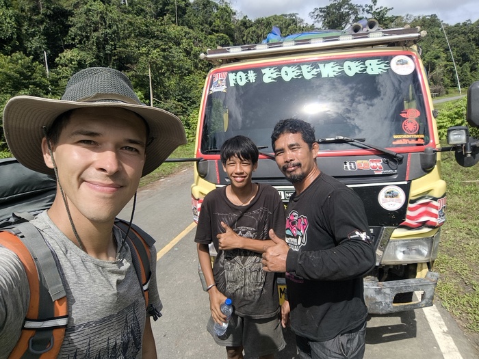 Долго ждать не пришлось. Рядом притормозил забитый пассажирами пикап. Из него вылез парень по имени Рэиза и пригласил меня в кузов, после чего залез и сам. Ему оказалось 33 года, он работает каким-то чиновником и любит охоту в любых проявлениях — хоть подводную, хоть на оленя. Выяснилось, что они едут в составе двух машин очень далеко — в Бинтуни, но мне не по пути. Проедусь с ними лишь до развилки.