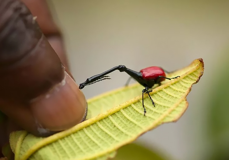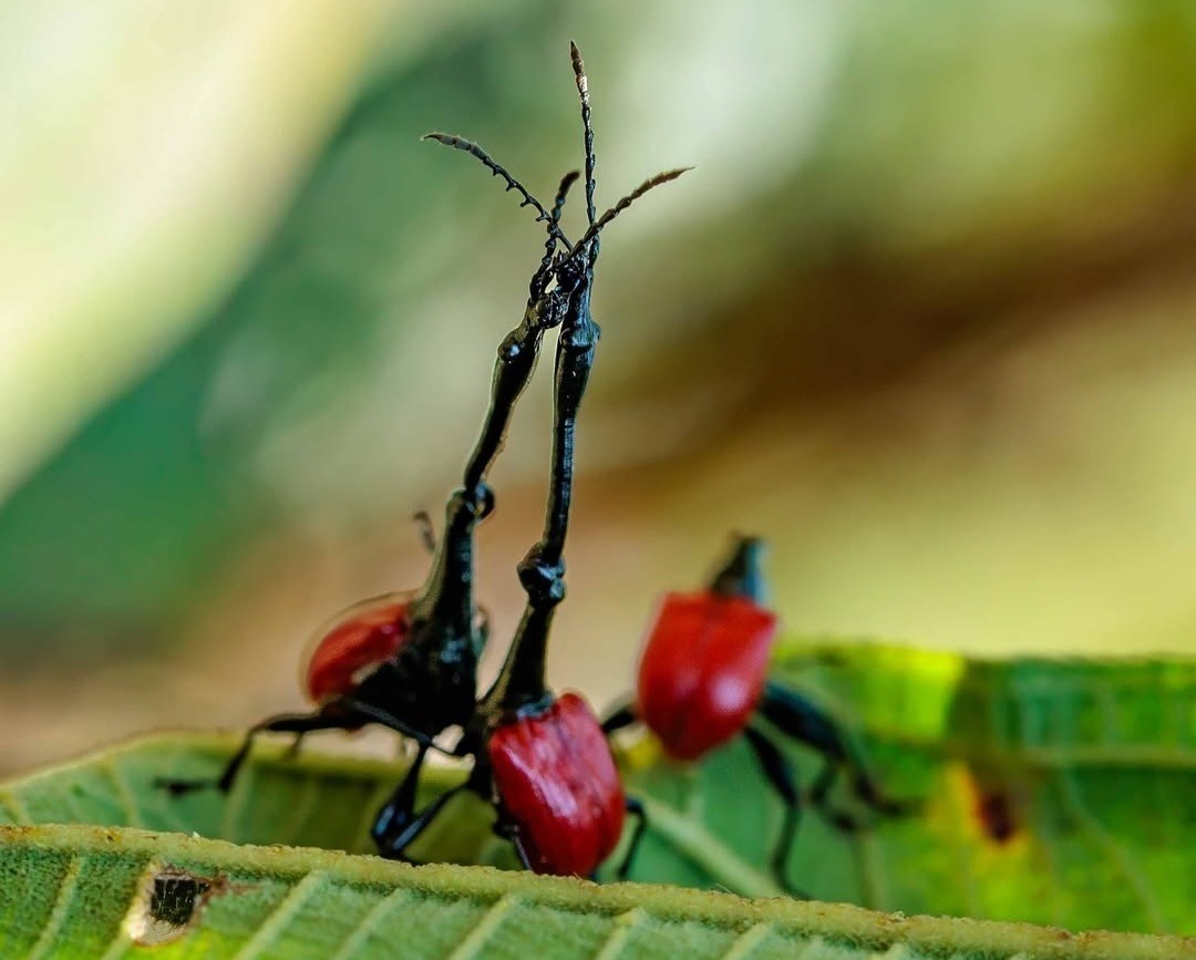 Всё верно, как те олени, самцы жуков-жирафов сходятся в поединке за право обладания прекрасной дамой. Сражаются соперники, словно на арене, на листе местного кустарника из семейства меластомовых, с которым вообще неразрывно связано всё их жучиное существование от момента зарождения жизни в яйце до самой смерти. Для жуков эти листья не только арена для боёв, но и постель, и еда, и зона для прогулок, и колыбель для подрастающего поколения.
