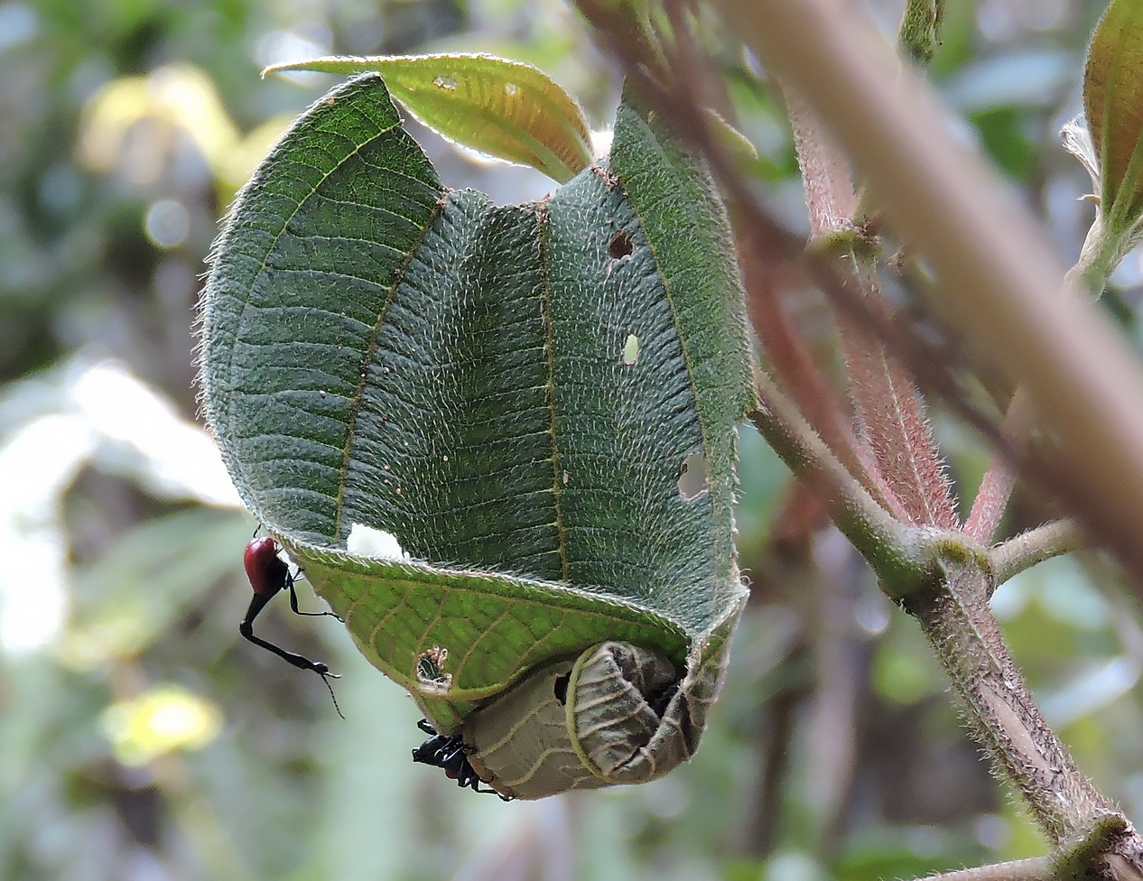 Сначала самка складывает кончик листа пополам по средней жилке, а потом начинает сворачивать лист в рулон, от конца до самого черешка, и в процессе упаковывает в него яйцо так, что оно оказывается в самой серединке рулона. Когда лист полностью свёрнут, самка отрезает его у основания, и готовое гнездо падает в лесную подстилку. На всё про всё уходит около 30 минут. Ну а вылупившаяся впоследствии гусеница съест свой лист-колыбель. Безотходное производство, как говорится.