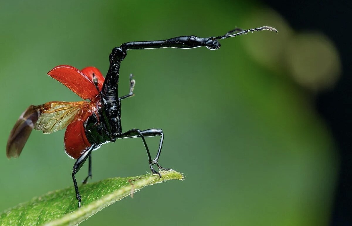 Но страсти между членистоногими жирафами кипят недолго, и дальше начинается изнуряющая работа и труд во имя будущих поколений. Однако трудиться самка будет в одиночестве. Самец, сделав дело, оставляет даму и отходит в сторону. Да-да, именно отходит, ведь с таким смещённым центром тяжести летать для него – недостижимая мечта. А свои красивые красные крылышки жуки-жирафы используют для отпугивания хищников.
