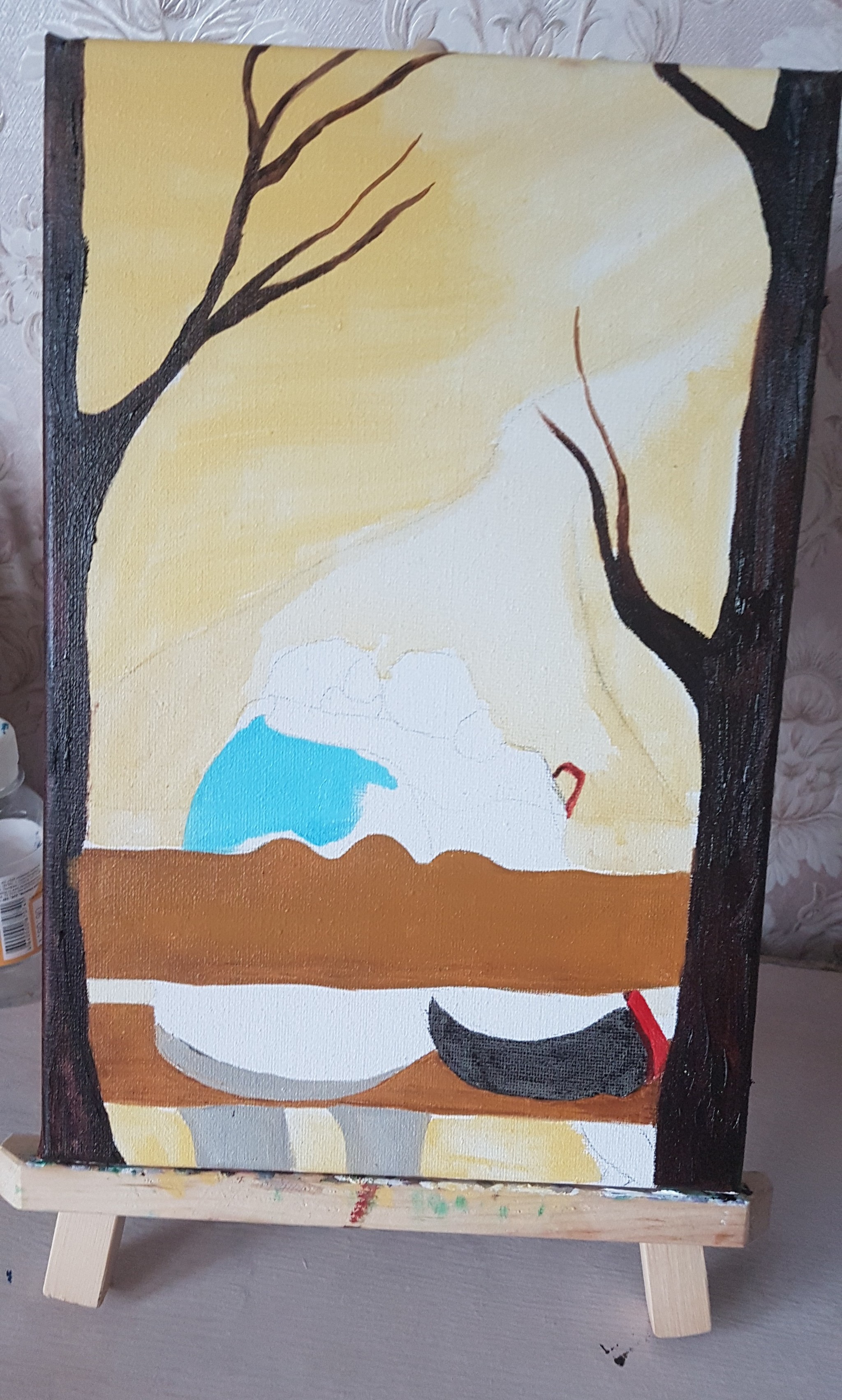В итоге решила изменить цвет одежды. И скамейка по форме претерпела изменения от первоначальной задумки на бумаге