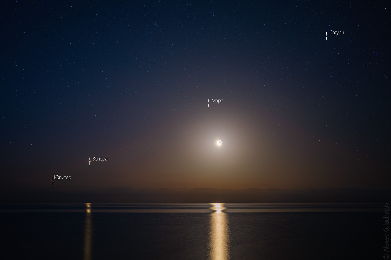 В сегодняшнем параде участвуют пять планет и Луна. Юпитер, Нептун, Венера, Марс, Луна и Сатурн. Это можно сказать рекорд.