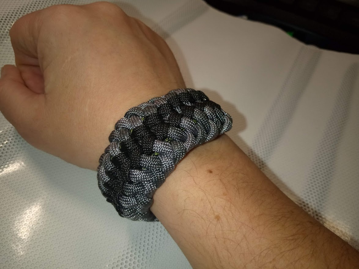 Потихоньку и разбирался в разном паракорде. Чем отличается китайский (много цветов, мягкий, но неплотный), настоящий "американский" (очень плотное плетение), украинский (мягкий, разнообразные смесовые оплетки). Ну и поиск удобного решения для фиксации на руке. От фастексов до затяжек и крючков-якорей. Включительно самодельные из карбоновой трубы.