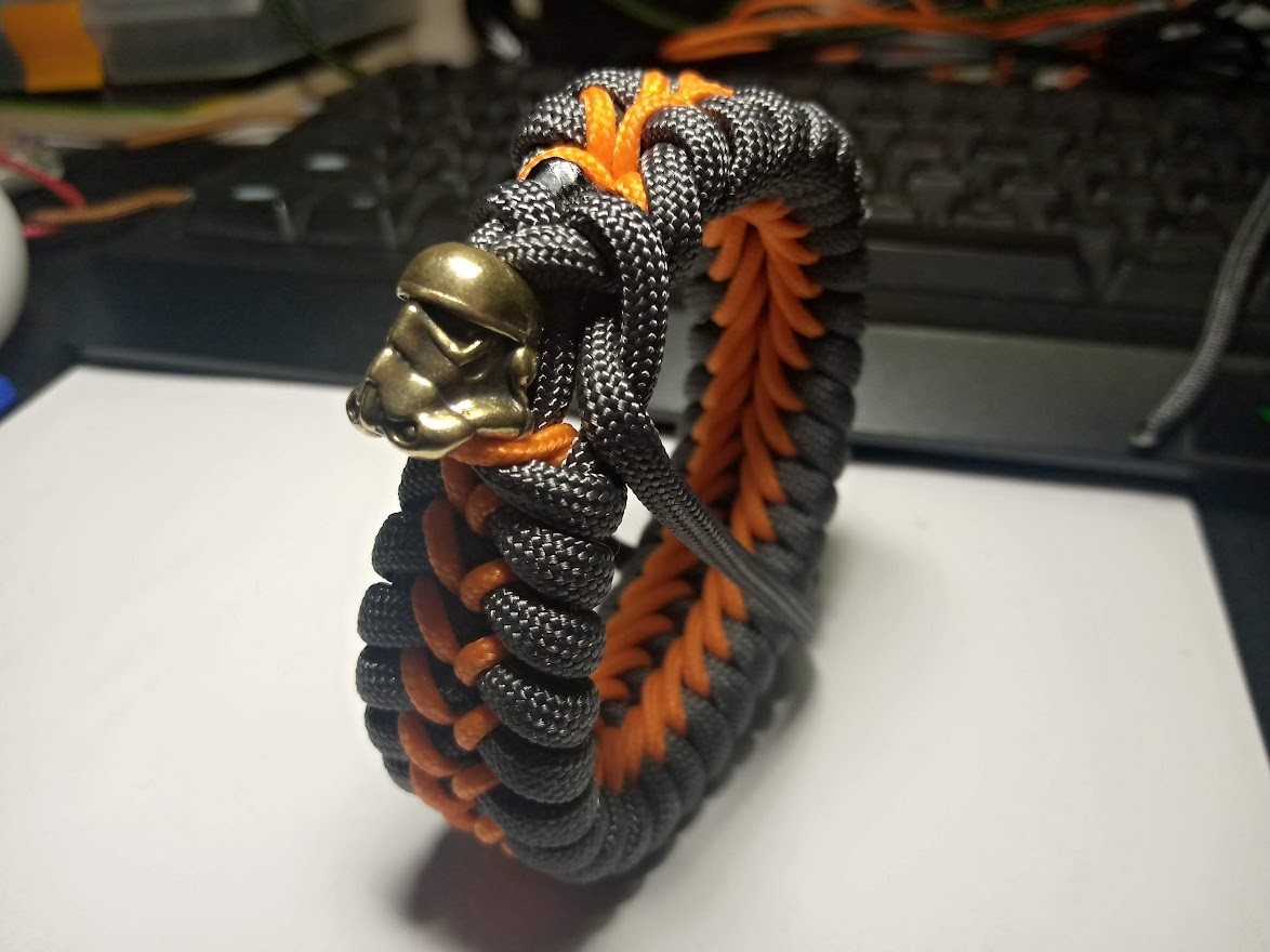 Браслет вышел очень широким. Слишком широким даже (3.5см против 2.5см у "штурмовика"). Черная "стяжка" - плоский шнур (паракорд без сердцевины). Плетение довольно простое, но лучше обзавестись станком чтобы держать осевые нити (кусок фанеры и две офисные прищепки).