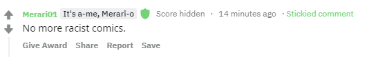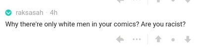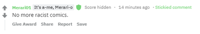 В скором времени я запостил «Punishment for angel» (https://www.reddit.com/r/comics/comments/bnnk1t/punishment_f...) и начал ждать реакции публики. Сначала она была совершенно неявной – рейтинг поста оставался одинаковым. Судя по всему, его минусовали, но на Реддите рейтинг не может опускаться ниже нуля. Через 12 минут внезапно прилетел комментарий от alicesaeep, который гласил: «Racist much?». Тут я понял, что из двух возможных вариантов (либо воспримут юмор комикса нормально, либо закидают помидорами за расизм) более вероятным является второй. В общем то, примерно это и произошло, когда пришел один из модеров (тот самый, кстати, который мне права постить до этого выдавал) и сказал «No more racist comics.», заморозив пост и все комментарии под ним. Я думал, что за подобную выходку мне влепят перманент, но не тут-то было – даже спустя 2 часа ко мне не применили абсолютно никаких санкций.