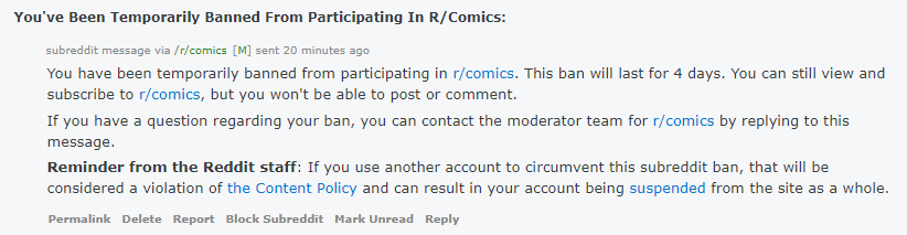 Коль западная аудитория не оценила райское гетто с неграми, я решил сделать другой пост, который, вроде как, не должен был нарушать какие-либо правила. Как и в прошлый раз, я перевел на английский комикс «Денежное» (оригинал https://pikabu.ru/story/denezhnoe_6355152), и закинул на саб (Unfair payment - https://www.reddit.com/r/comics/comments/bnole3/unfair_payme...). Реакция оказалась доброжелательнее: ставили положительные оценки (в итоге рейтинг достиг 172, при том что на Пикабу этот же комикс получил оценку 13563) и писали адекватные юмористические комментарии. Однако, через некоторое время после создания этого поста, мне прилетело письмо счастья, в котором говорилось, что мне выдали 4-дневный бан. Это было довольно-таки внезапно. Я спросил в ЛС у модеров о том, что произошло, но из-за корявеньких словесных оборотов на английском они почему-то посчитали мое сообщение не очень вежливым и отрубили чат с ними до окончания срока бана. На вопрос что это было я и сам не могу дать точного ответа; скорее всего они решили меня наказать за нигерское гетто в раю, но сделали это с опозданием.
