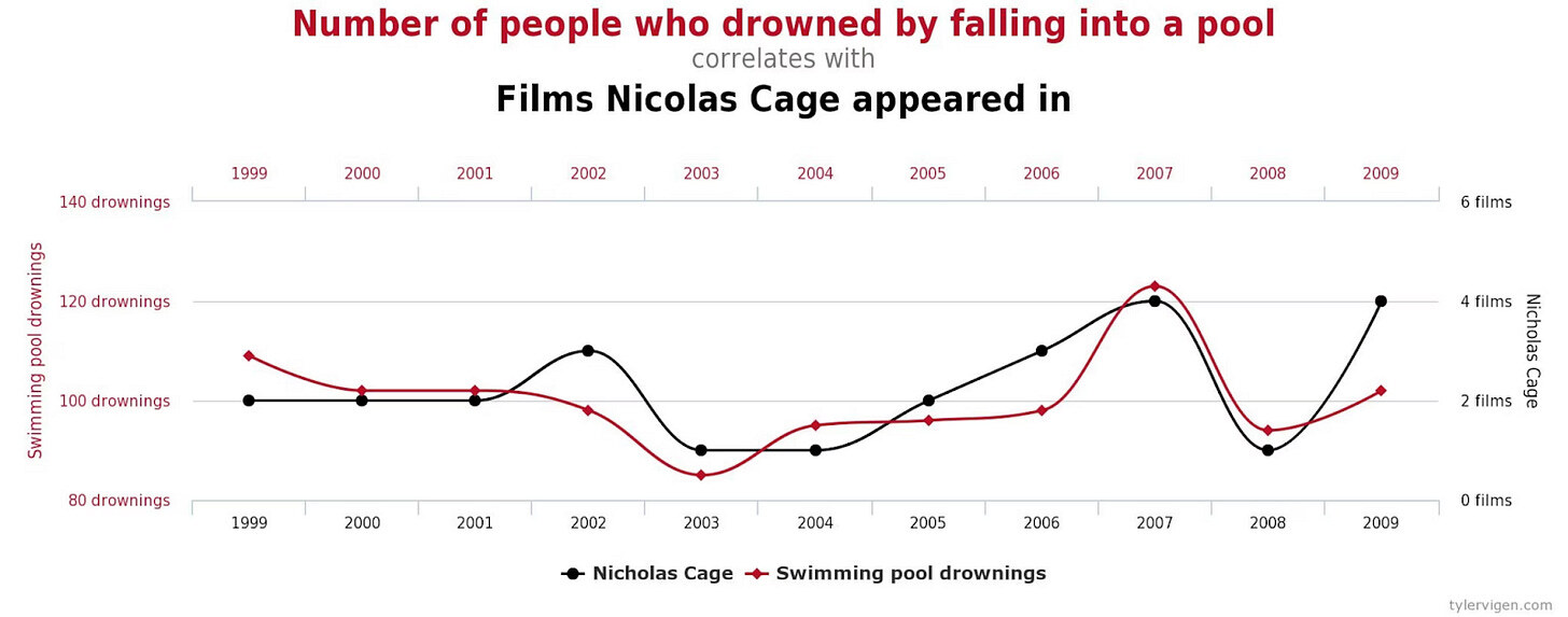Но некоторых людей такое объяснение не устраивает, и они ищут внешнюю причину. Сперва — прививки, теперь — парацетамол. Забавный факт: рост аутизма в тех же США никак не скоррелирован с долей вакцинированных детей или с продажами парацетамола, которые последние лет 20 на душу населения волнообразно колеблются, но в среднем остаются на одном уровне (в течение последних 20 лет количество выписанных рецептов варьируется от 3 до 9 миллионов в год, но не растёт монотонно) [6]. Вообще корреляция и та не означает причинно-следственную связь. Мало ли, что с чем коррелирует. Вон и количество фильмов с Николасом Кейджем коррелирует с количеством утонувших в бассейнах. Но здесь даже такой корреляции нет. Люди не стали чаще принимать парацетамол на фоне роста числа диагнозов аутизма. Но может аутизм и правда встречается чаще у тех, кто принимал лекарство?