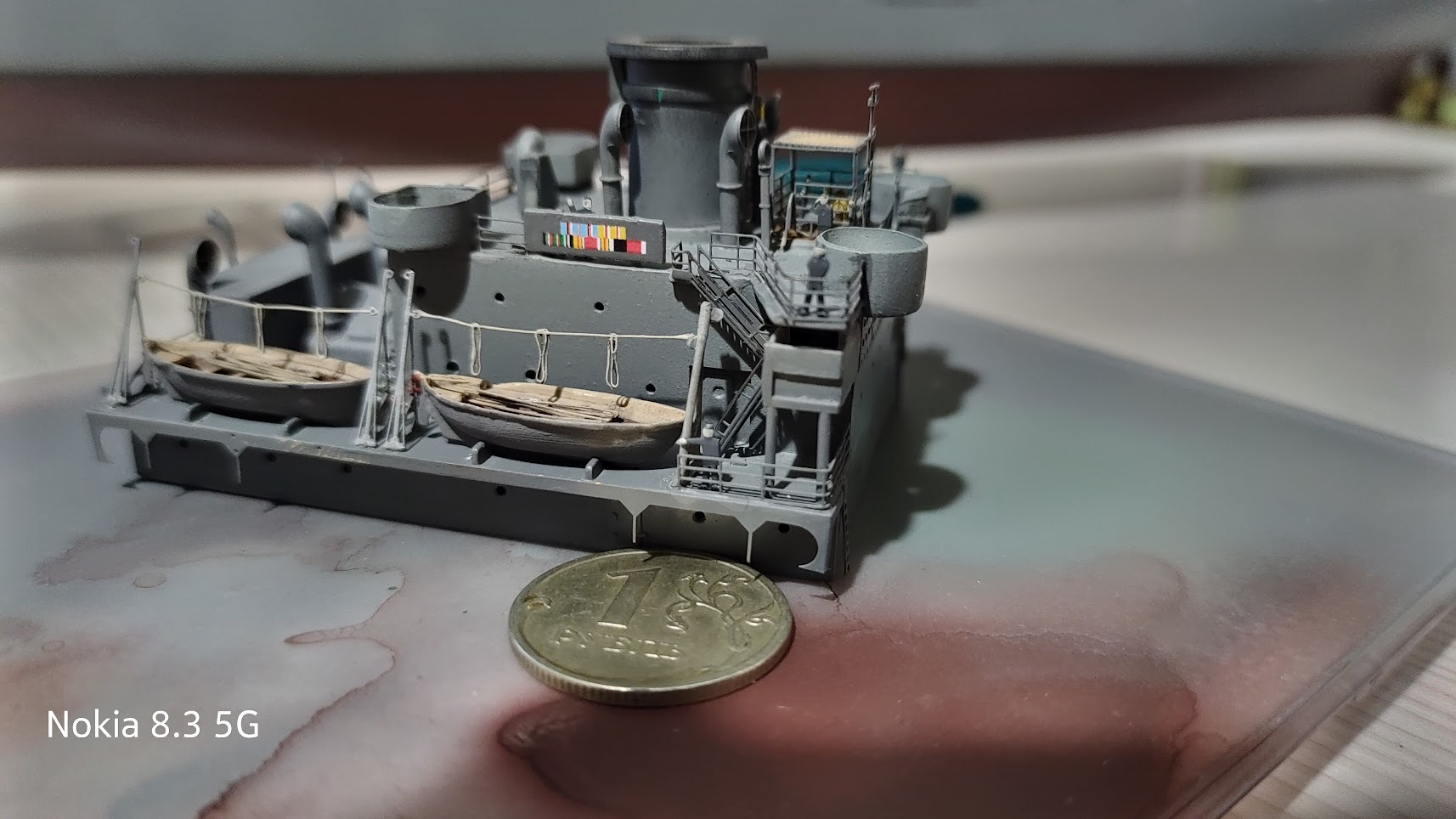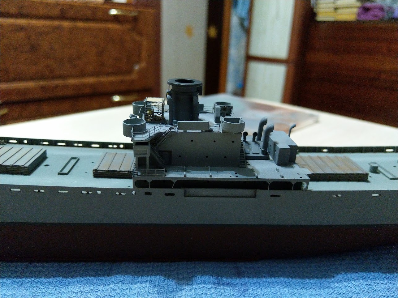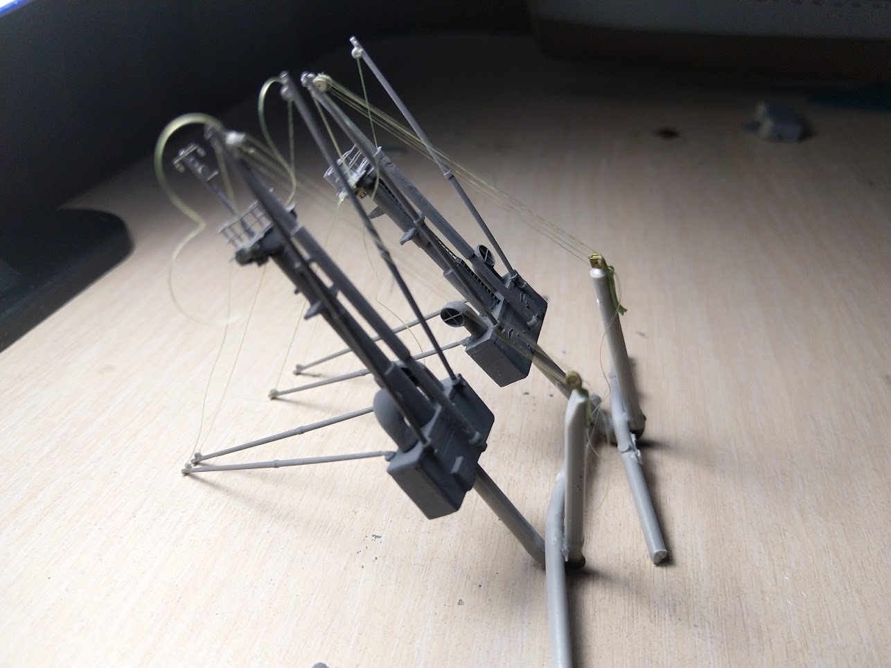 Делал модулями. Корпус, центральная и кормовая надстройки отдельно со всеми причиндалами, мачты со стрелами на своих "островках", что очень удобно.