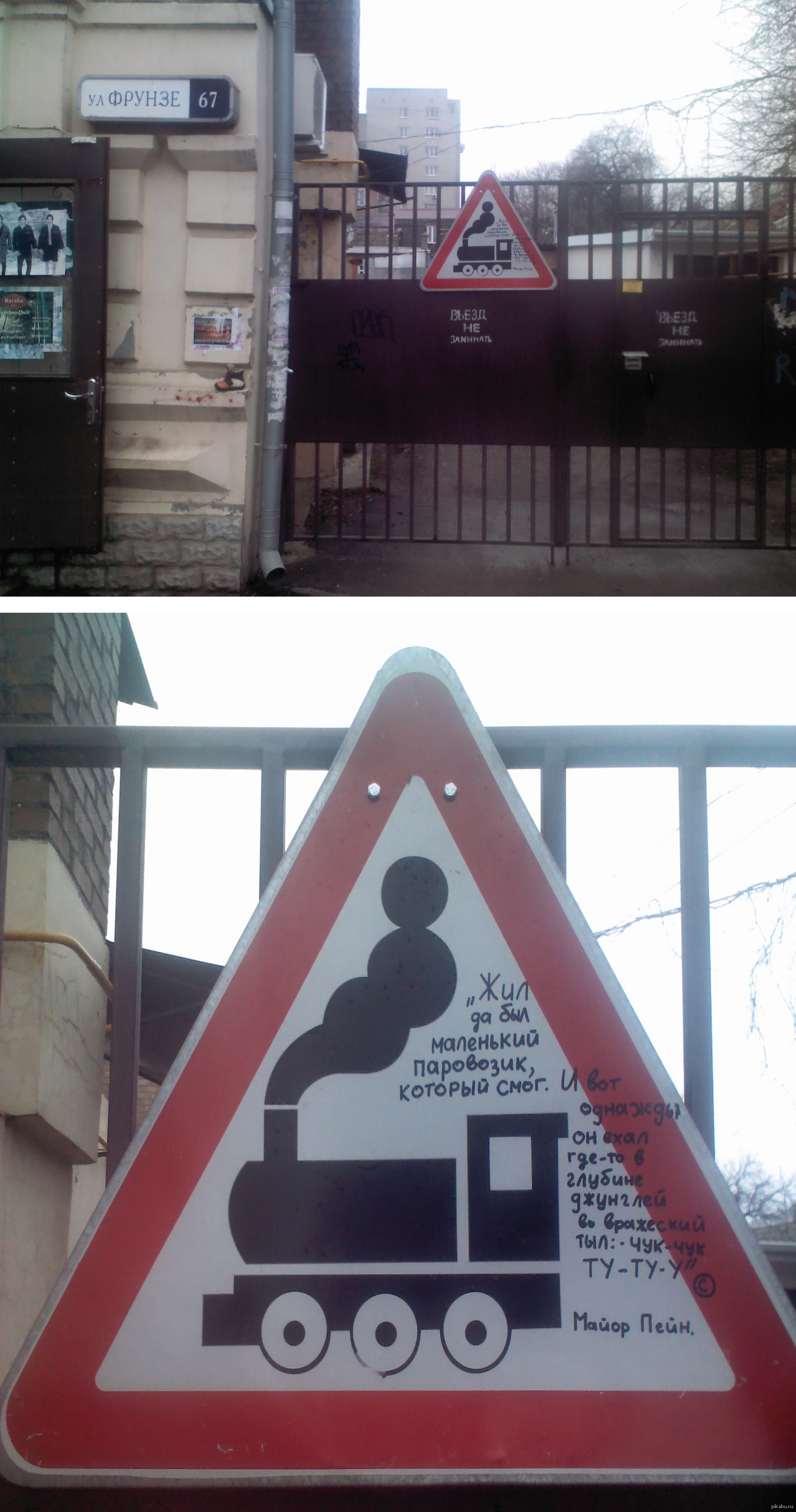 308 MrMOSKvich Паровозик, который смог. 12 лет назад Гуляли с другом по городу, как вдруг увидели дорожный знак, на котором было что-то написано... подошли поближе и вот, что увидели: [моё] Дорожный знак Паровозик который смог