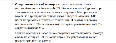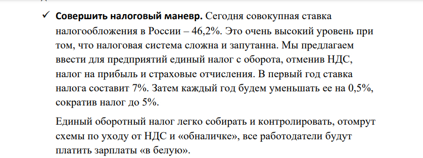 Не, про налоги они писали, что нужно их снизить. В целом это верное решение, т.к. уровень налогообложения сейчас огромный.