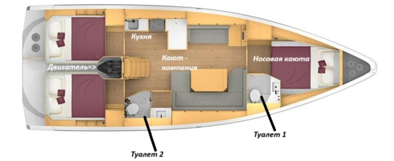 Прячется за неприметной дверью в кают компании. На яхте в норме от 1 до 3 туалетов. Чаще всего туалет совмещен с душем, а иногда помещение туалета совмещено с душевой кабиной. Так экономится место. Душ сливается прямо за борт специальным насосом.