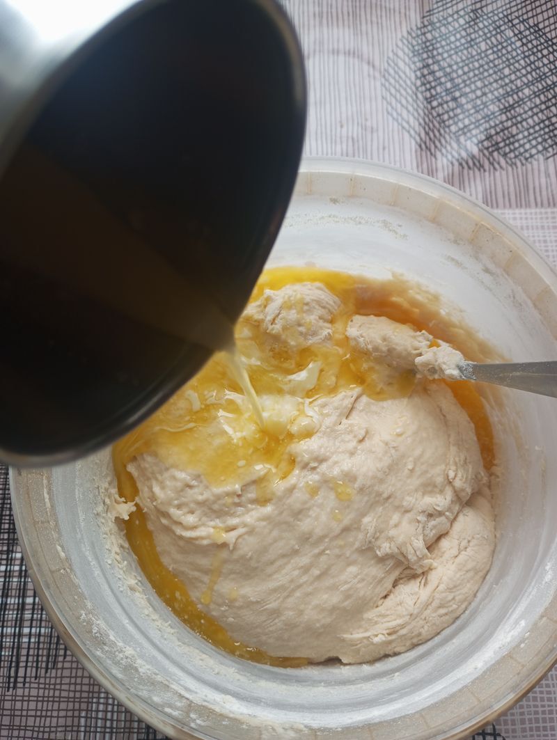 хорошо промешиваем муку и опару, добавляем растопленное сливочное масло.