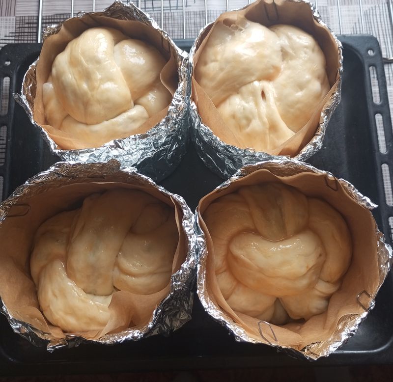 10. Каждую косичку сворачиваем удобным способом и помешаем в подготовленные формы для выпекания. У меня самодельные из фольги, но лучше выпекать в специальных формах, потому что в моих из фольги плохо пропекались бока и мне приходилось куличи еще допекать с боков.