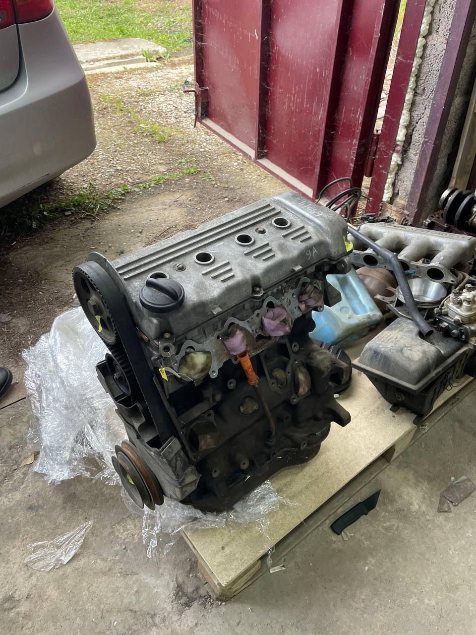 Двигатель 9А с Volkswagen Passat B4. Запомните эту информацию. Двигатель новым назвать язык не поворачивается, но будем считать его новым для этой машины. По словам продавца, снят в рабочем состоянии с автомобиля. Не дымил, не коптил. Но весь чумазый. Надо будет весь его отмывать. А еще выплыли сразу неприятные моменты: часть крепежа была разбита. Как, например, болты шкива коленвала. Обиднее всего, что с блока снимали навесное не очень аккуратно. Как итог – три шпильки обломаны под корень. Один набор экстракторов я уже купил. Теперь надо заказывать второй, отдельно для выкручивания шпилек, так как высверливать с повреждением резьбы я не хочу. Хотя они так и так мне нужны были для того, чтобы выкрутить винт стартера на старом двигателе.