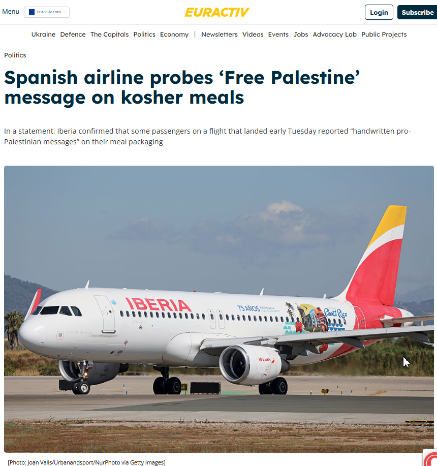 Испанская авиакомпания Iberia заявила во вторник, что начала расследование после того, как пассажир, заказавший кошерную еду, получил поднос с едой, на упаковке которого было написано «Свободу Палестине».