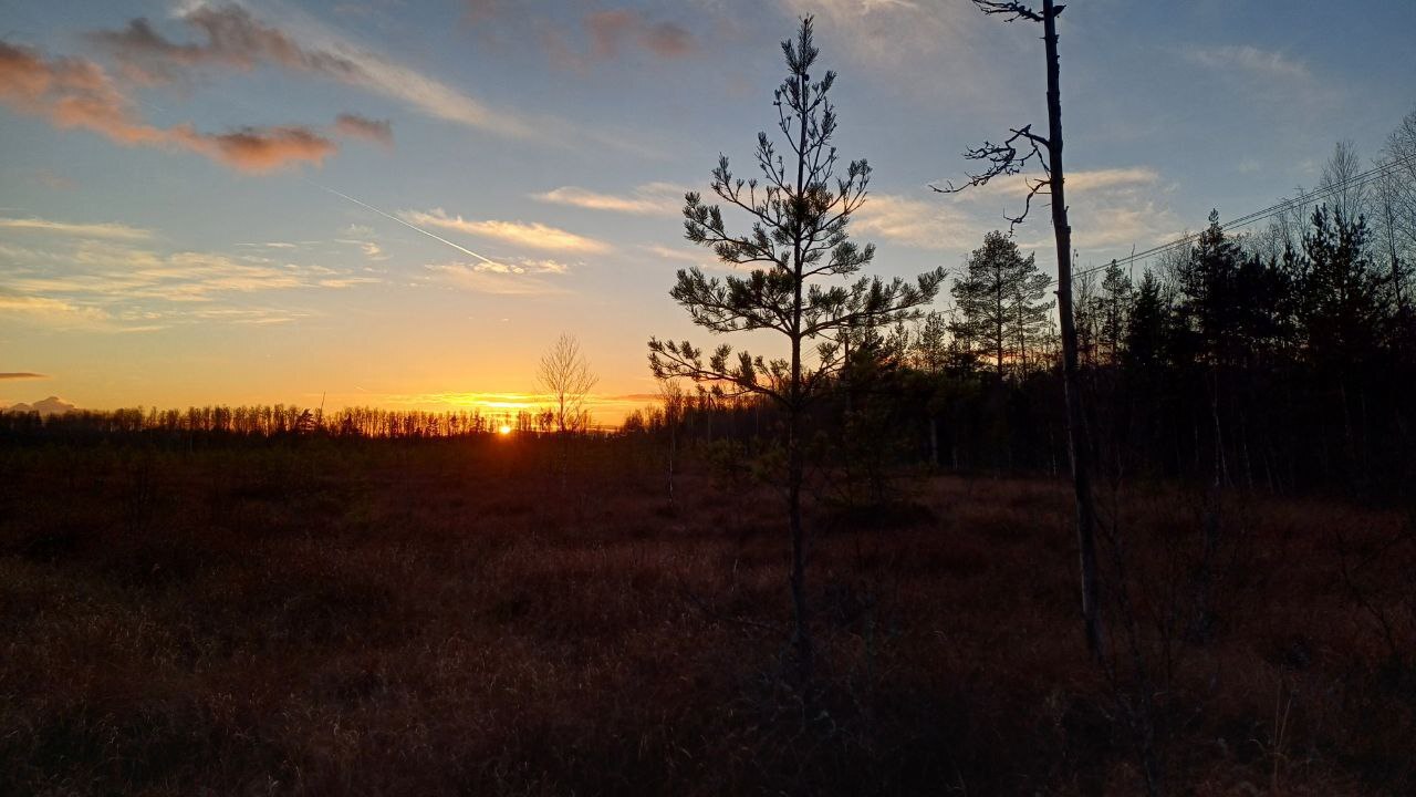 А зато распогодилось! С очистившихся небес светит заходящее солнце. Дальнейший путь лежит на запад, по заросшей ивняком и ёлками насыпи под маленькой ЛЭПкой – к последней на маршруте стрелке. По обе стороны – живописное болото. Коля в забродниках уходит по пояс в пушистое, классическое моховое болото - и теперь уже Оля вытягивает его оттуда за палочку…