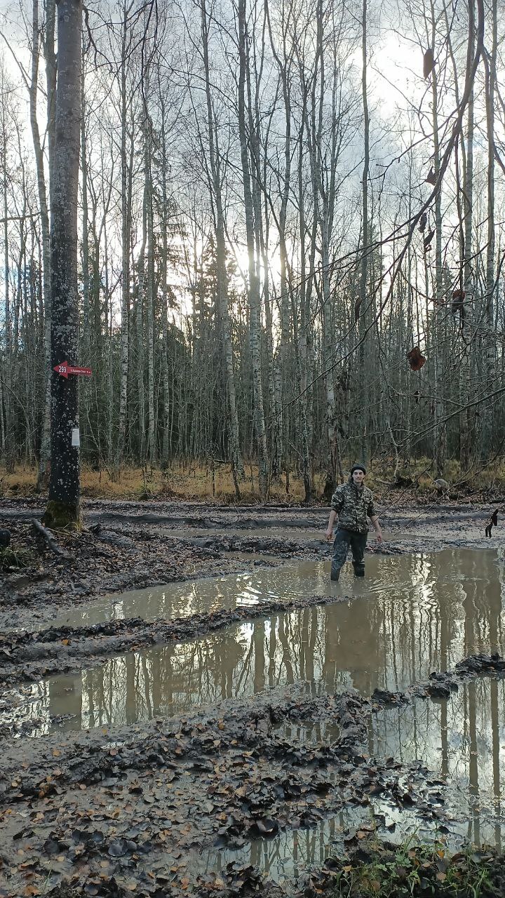 Беда в том, что до них по просекам прошли дожди и тяжёлая строительная техника. Они превратили линейки в водно-грязевые преграды. Промеряли эти просеко-реки Колей, который был с забродниках: местами их глубина составляла примерно 1/3 спасателя! Оля, будучи в обычных сапогах, туда и не совалась – обходила лесом. Но лес оказался ещё коварней разъезженных дорог. Под слоем пестрой листвы сброшенная тракторами на обочину глина выглядела вполне проходимо... Ага, как бы не так!