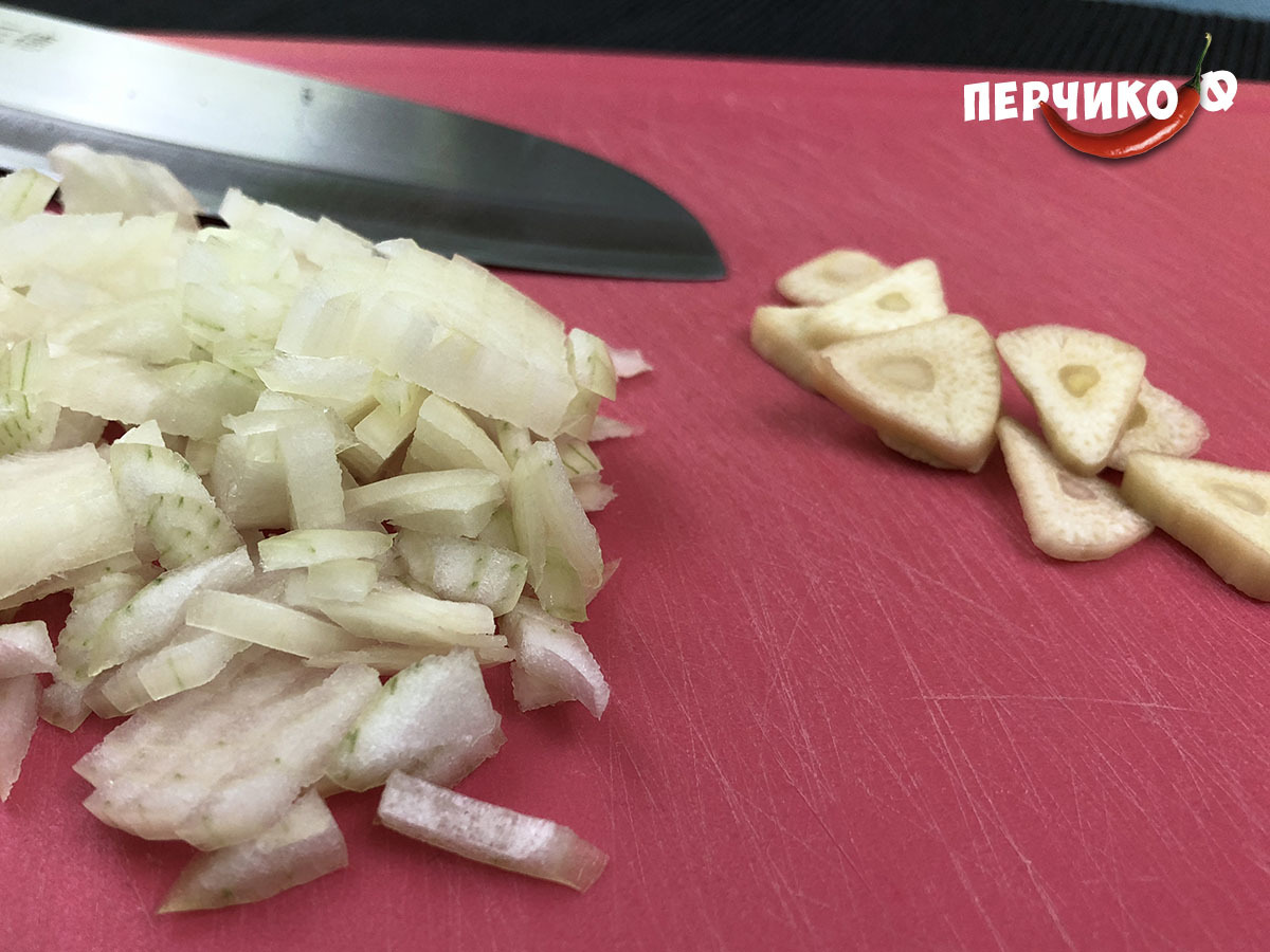 Далее мелким кубиком шинкуем репчатый лук, а зубчик чеснока нарезаем на тоненькие пластики.