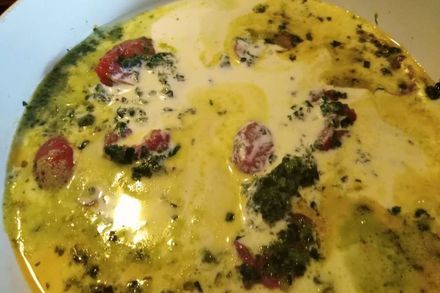 5. Шпинат разошелся, добавим сливки. Посолим, поперчим по вкусу. Все перемешаем. Соус готов.