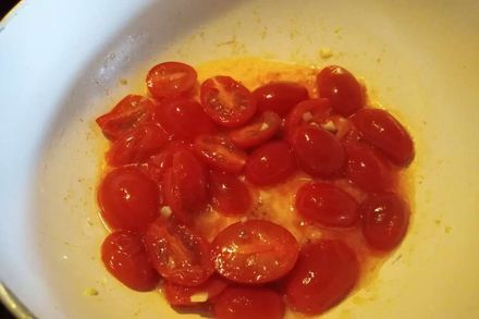 3. Помидоры черри порежем на половинки вдоль. Добавим к чесноку, который уже поделился своим восхитительным ароматом с маслом. Продолжим тушить.