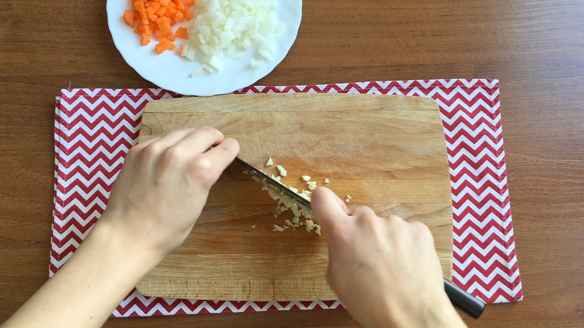 Ножом расплющиваем зубчик чеснока и мелко его рубим.