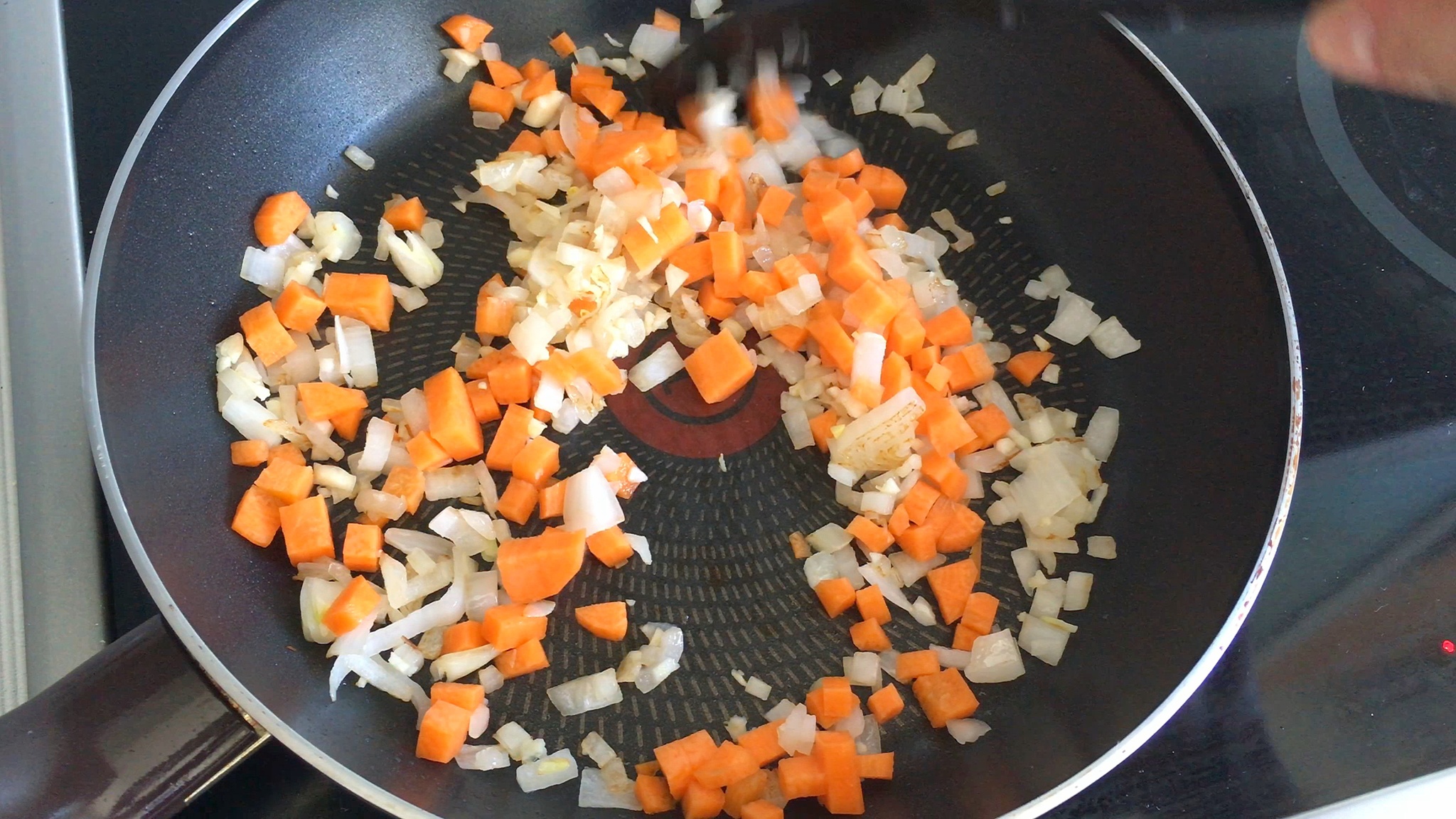 Разогреваем сковороду на сильном огне, наливаем оливковое масло. Обжариваем лук примерно 2-3 минуты, добавляем чеснок обжариваем минуту. Добавляем морковь и обжариваем минуты 2.