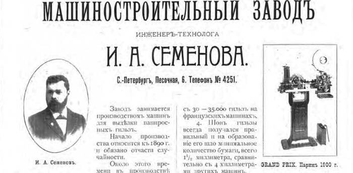 На табачной фабрике А.Н. Шапошникова, куда в 1887 году пришёл работать механиком Иван Александрович Семёнов, стояли как раз машины «Перро Мино». 25-летний Семёнов, недавно окончивший Петербургский технологический институт был весьма талантливым инженером, потому он довольно скоро стал заведующим машинным отделением на фабрике и попутно модернизировал имеющиеся станки. Поняв, что с его способностями работать на дядю необязательно, он в 1890 году берёт ссуду и открывает на Обводном канале (Санкт-Петербург) свою механическую мастерскую на 15 служащих, на которой уже в том же году выпускает собственный аппарат для производства гильз. Даёшь импортозамещение!