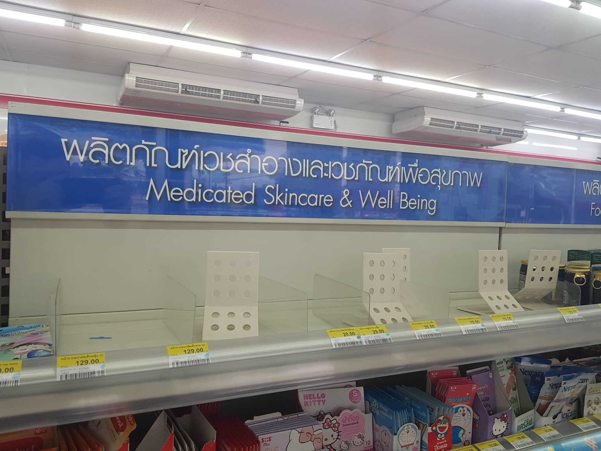 Все просто, весь мир сходит с ума из-за короннавируса. Вот например фото снятое в далеком Районге за полтора часа езды от Паттайи. Тут китайцев сроду нет, однако ВСЕ маски в магазине скуплены - их просто нет...