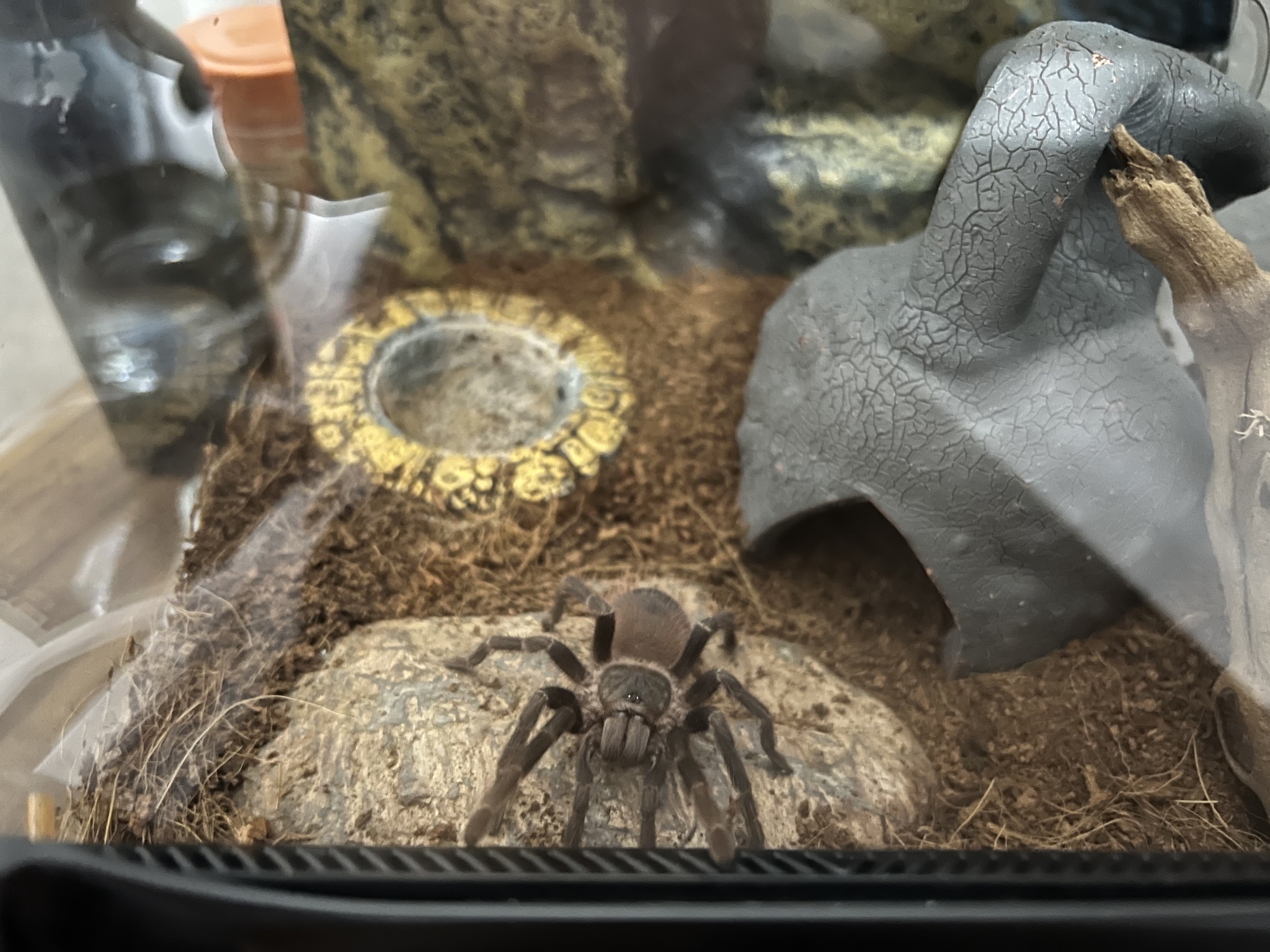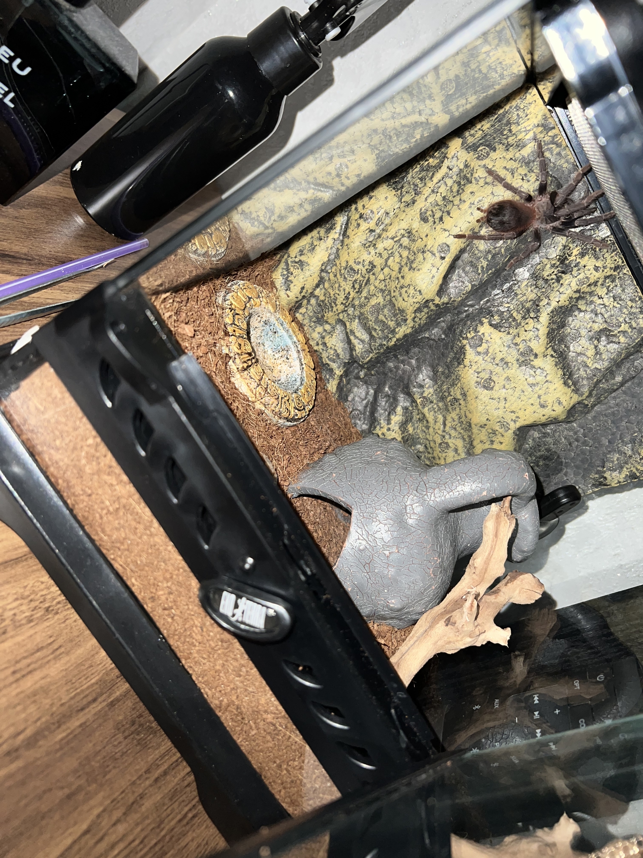 UPD Друзья, оказалось, это действительно шкурка после линьки. Самым смелым оказался программист, который сегодня утром и прислал нам новые фотографии, а также проверил - домик пуст. Паук уехал. Террариум решили оставить, возможно про него вспомнят. Спасибо всем за отклики и прошу прощения за панику!