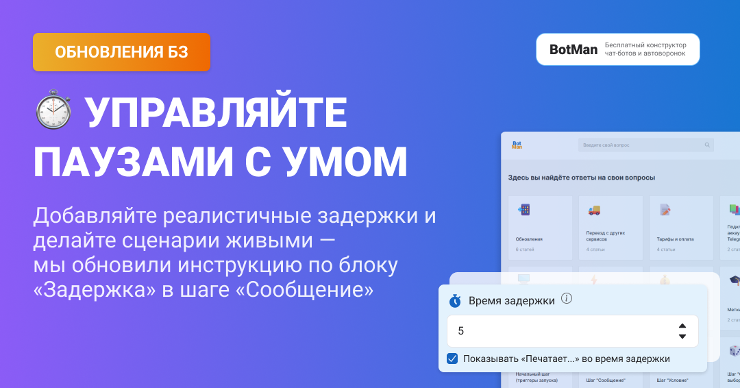 Мы обновили инструкцию по блоку «Задержка» — теперь ещё понятнее, как задать нужный ритм общения.