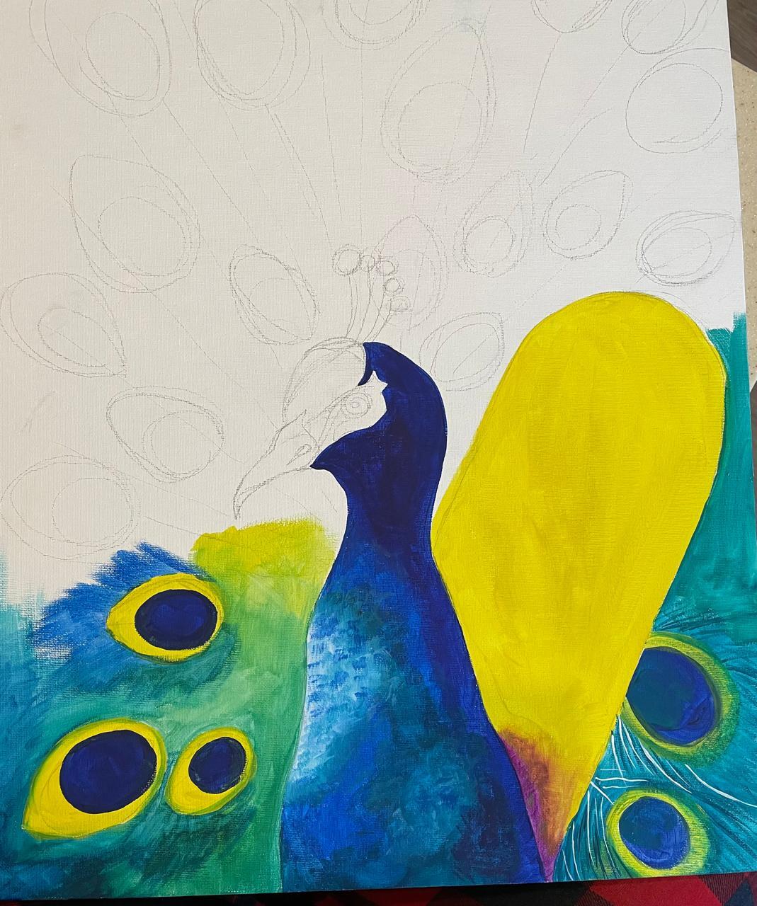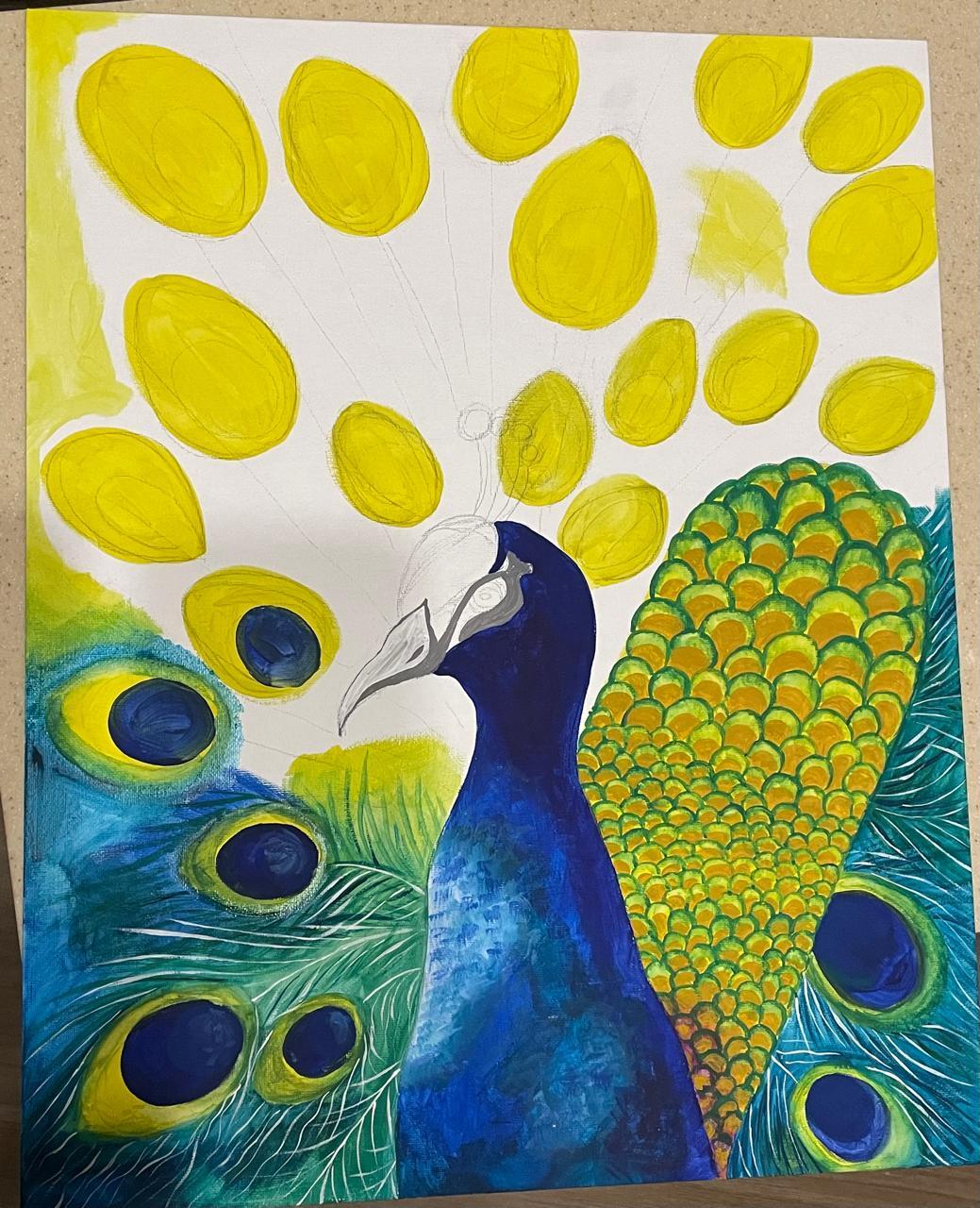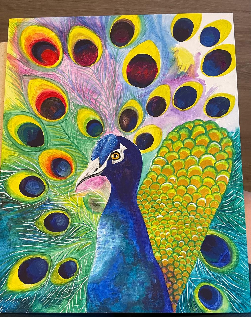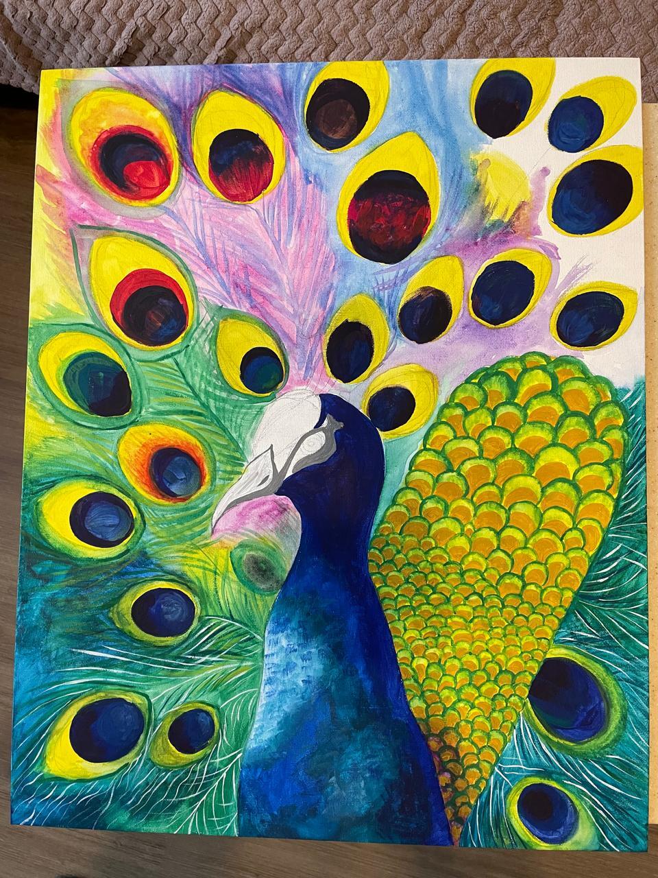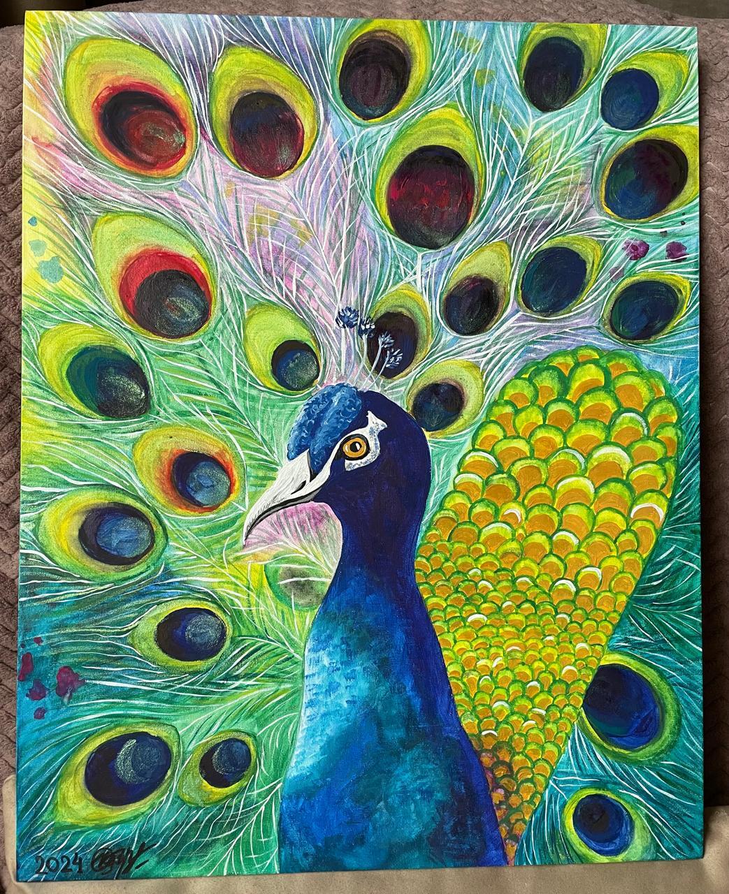 Хочу обратить Ваше внимание на то, что перья павлина дополнены блестками от акварельной краски Tintura. Если смотреть на павлина под разными углами, перья играют несколькими оттенками блеска.