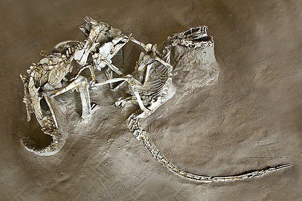 Один из самых удивительных образцов окаменелостей. Найден в пустыне Гоби, Монголия, в 1971 году. Велоцираптор Монгольский (Velociraptor mongoliensis) схвачен за лапы протоцератопсом (Protoceratops andrewsi). По видимому, оба ящера мгновенно погибли, будучи засыпанными песком осыпавшейся дюны или селевым потоком.