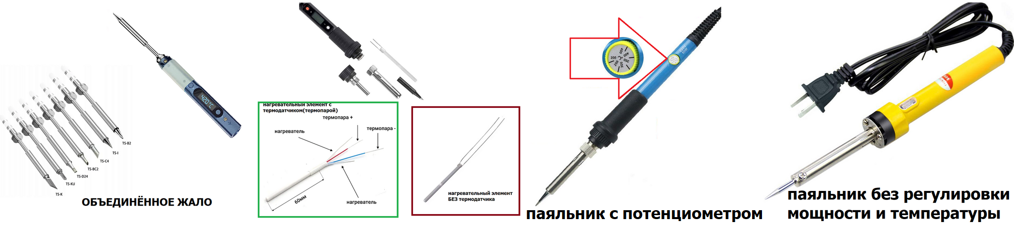 1) с объединённым жалом (нагревательный элемент + термодатчик + само жало), паяльник будет с регулировкой температуры и одновременно будет следить за температурой в реальном времени.