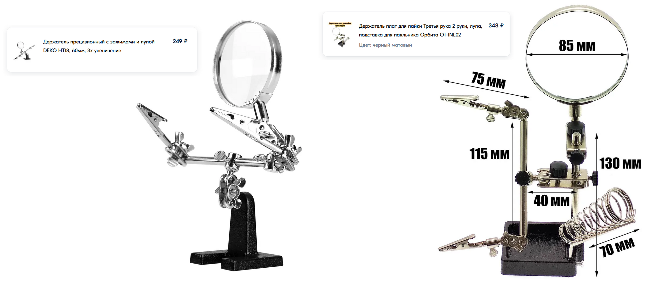 Можете собрать её из подручных материалов, стеклянная лупа и зажимы "крокодильчики" стоят недорого.