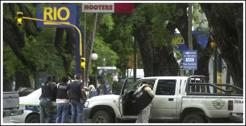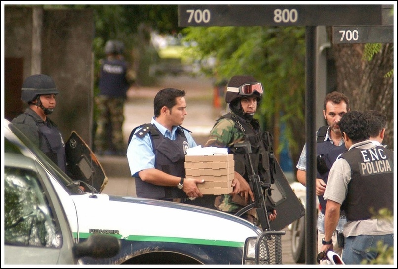 Прошло два часа. Спецназ чешет репу, ожидая команды на штурм — пицца уже остыла, а они заряжены вломить негодяям по самые помидоры за потраченное время и нервы. Полиция тоже чешет репу, не зная, отдавать ли такой приказ вообще — мало ли что, мертвые заложники будут некрасиво смотреться в газетах и телевизоре. Да и мэр Буэнос-Айреса твердо и четко приказал не стрелять — от слова совсем. На то были основания — 17 сентября 1999-го тройка грабителей вломилась в отделение «Banco de la Nación», другом пригороде Буэнос-Айреса. Там бандиты были молодые и дерзкие, а полиция вместо переговоров стреляла на поражение из автоматов, потому при аресте один грабитель умер, а с ним за компанию и двое заложников. Вроде случайность и сопутствующий профессиональной деятельности ущерб, лес ведь рубят, а щепки летят, и всё бы ничего, но… не тогда, когда это происходит в прямом эфире на глазах у всей страны.