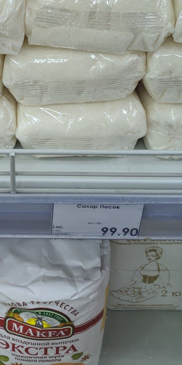 у нас сахар песок седня с утра по 100 рублей за кило в магазине лежал. до вакханалии было около 60 рублей.