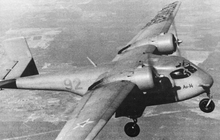 Первый полет самолет Ан-14 совершил 14 марта 1958 г., пилотировал машину летчик-испытатель ЛИИ В.Н. Изгейм. Первая машина использовалась в заводских испытаниях. Самолет был оснащен трехлопастным металлическим винтом и прямым стабилизатором с прямоугольными килями на его концах. Вторая машина имела уже двухлопастный деревянный винт и стабилизатор с углом развала 9°. Третий самолет имел в хвостовой части большой люк для загрузки различных грузов и химикатов для сельскохозяйственных работ. В виде опыта O.K. Антонов наметил на карте 68 небольших населенных пунктов, не спрашивая, есть ли там посадочные площадки. Летчику дали задание приземляться в каждом пункте не далее чем в 200—300 м от околицы. За три рейса летчик побывал во всех предусмотренных точках и выполнил задание.