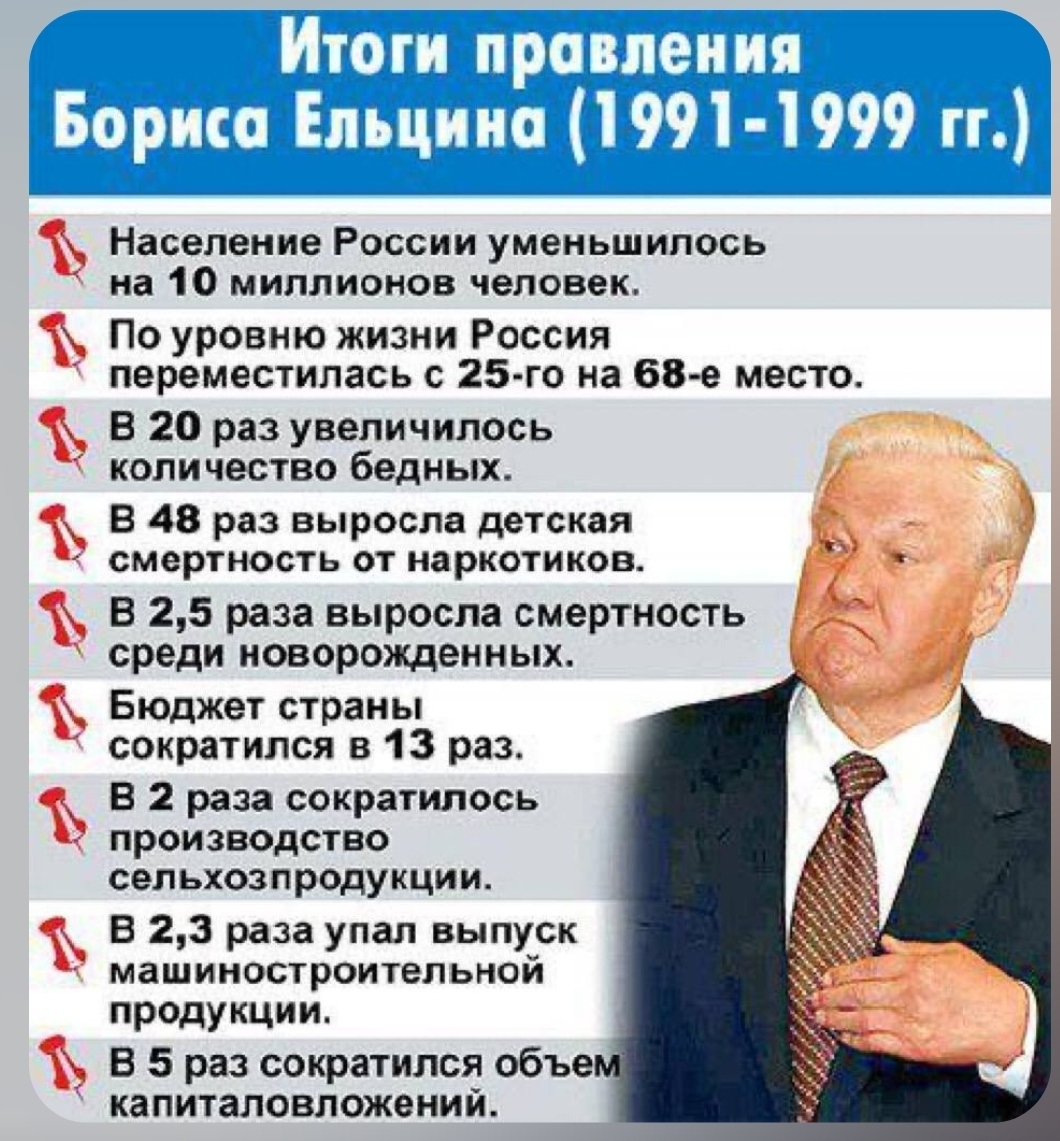 По общим итогам, время Б. Ельцина явилось «черной дырой» истории, в которую провалились все моральные и материальные ценности России, а сама Россия превратилась в страну, невозможную для проживания.