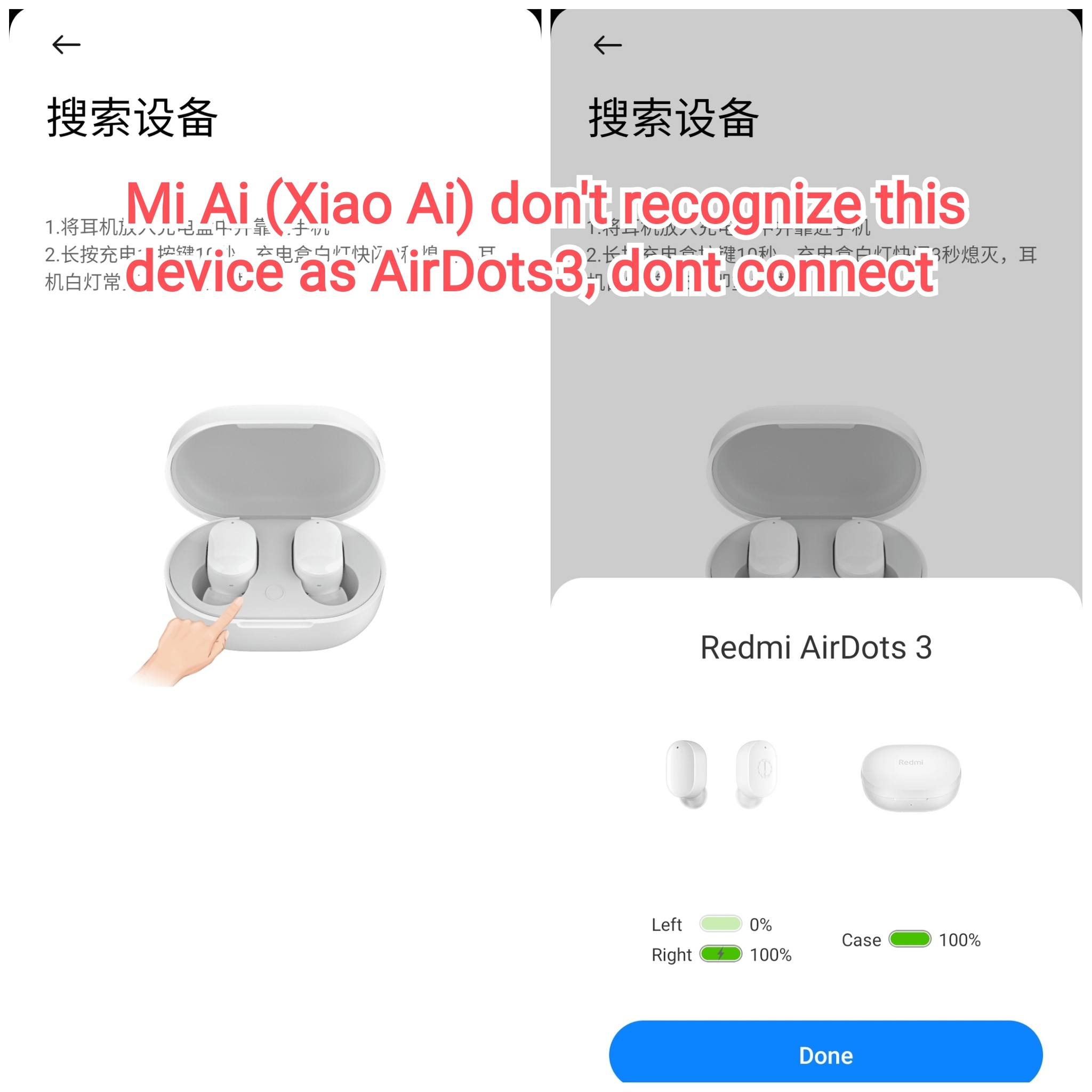 Воспользовавшись переводчиком, выполнил инструкции приложения. Но ничего при этом не произошло. В то время, как непосредственно телефон наушники узнал (видимо эту технологию подделать смогли, а вот Mi Ai'ровскую - нет).