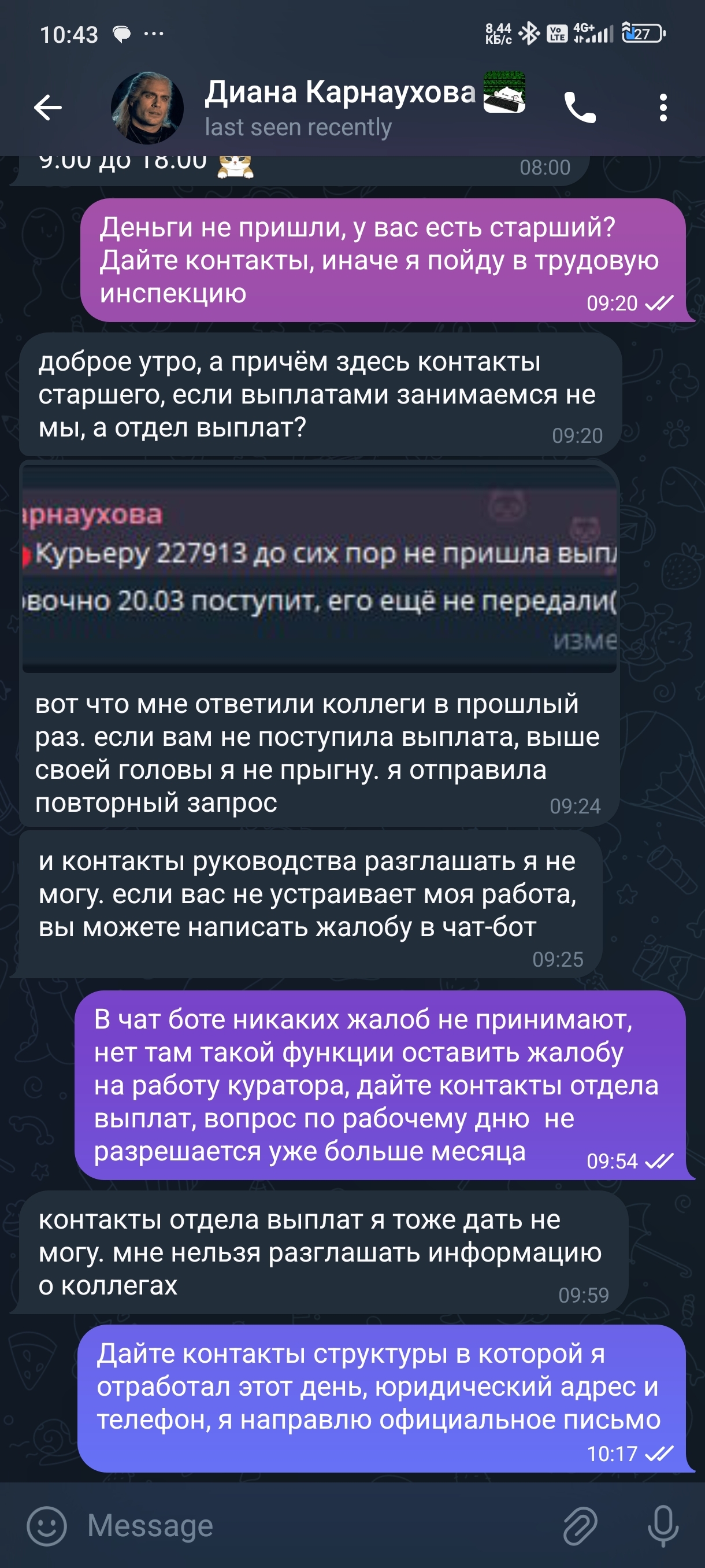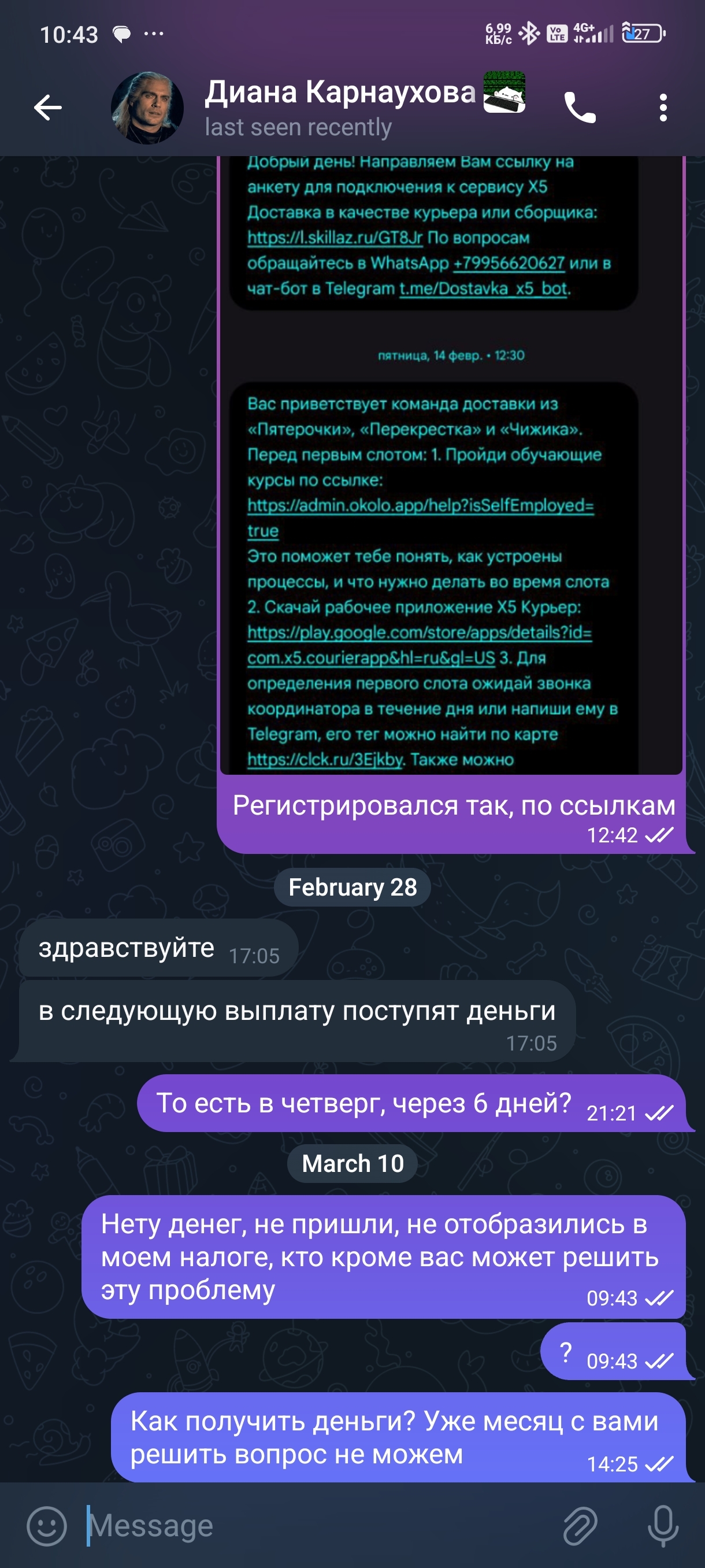 Отработал один день, 12 часов на линии, на машине, заработал немного денег, хотел посмотреть как это работать в доставке пятерочки и посмотрел... Поддержка ничего не поддерживает и делает все по шаблону не напрягаться с ответом и просто скипает тебя дальше стандартной отпиской. Куратор ничего не курирует и ничем не помогает отвечает изредка и долго, деньги мне за смену которая была 16 февраля не перевели вообще и даже когда переведут не знают, куратору на меня плевать, другого места в этой конторе где решают эти вопросы нету, только чат с куратором в телеграмм, видимо придется обращаться к юристу (я самозанятый)