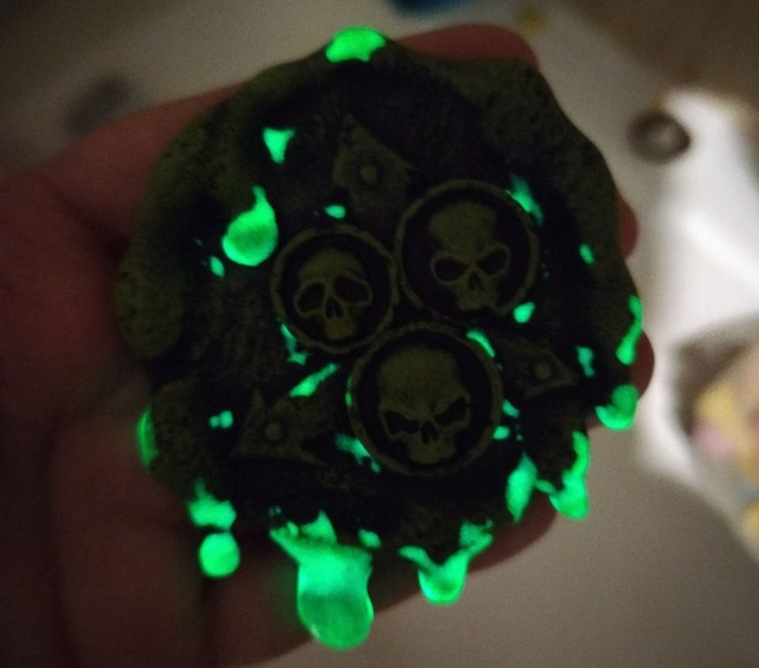 Теперь время экспериментов. Я заказала УФ смолу и светящийся пигмент, хорошо что лампа у меня есть) Замешиваю смолу с пигментом и зубочисткой наношу получившиесю смесь. Получается что-то такое.