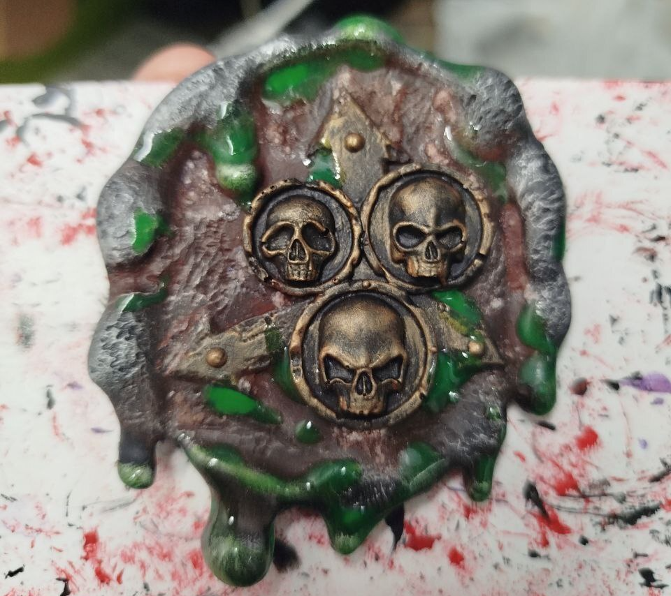 Далее подбор цвета.С одной стороны это закос под печать чистоты - значит красный? Но это ж хаоситы, мб металлик с ржавчиной? Или все же зелено-желтый, болотный, мне кажется он ближе к Нурглу.
