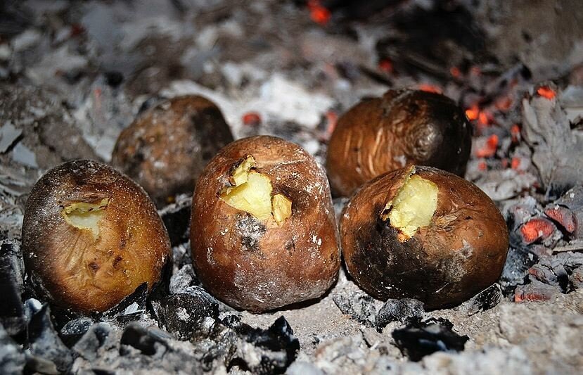 Время близилось к обеду, и желудок давал знать о себе, периодически погуживая. Запасливый Крестный не приметнул взять с собой мытые картофельные клубни, свежий зеленый лук, всякую зеленушку, половинку черного и соль. Мы развели костер на том месте, где это уже неоднократно делали до нас, ожидая углей, сидели на берегу, разговаривали и пили по очереди теплый чай из термоса. Настроение было на высоте, к тому же, щука радовала, и вот, наступил момент, когда нужно было доставать печеный картофель из углей. Сверху картошка выглядела совсем неаппетитно, и дядя Витя научил меня тогда, как правильно обедать в лесу.